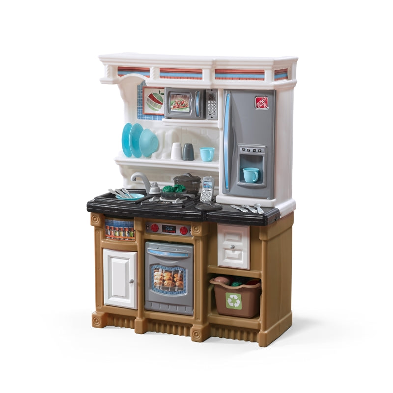 There’s no end to imaginary play with the Step2 Lifestyle Custom Kitchen™, where little chefs can play the day away with realistic kitchen amenities and other exciting features! Reach into the convenient refrigerator for fresh ingredients, and use the pretend water station for a refreshing drink. Activate the stovetop’s electronic lights and sounds with the special cookware to make bubbling and sizzling noises as each dish is prepared! The large countertop space has plenty of room to accommodate multiple kids as they prep meals together, and they can use the microwave with realistic keypad feature to “reheat” leftovers and the molded-in sink for clean-up at the end of each mealtime. A bonus for kids and parents alike, this pretend kitchen playset also incudes lots of storage space, from the dish rack to pull-out cabinet and recycling bin. Made in USA of US and imported parts.