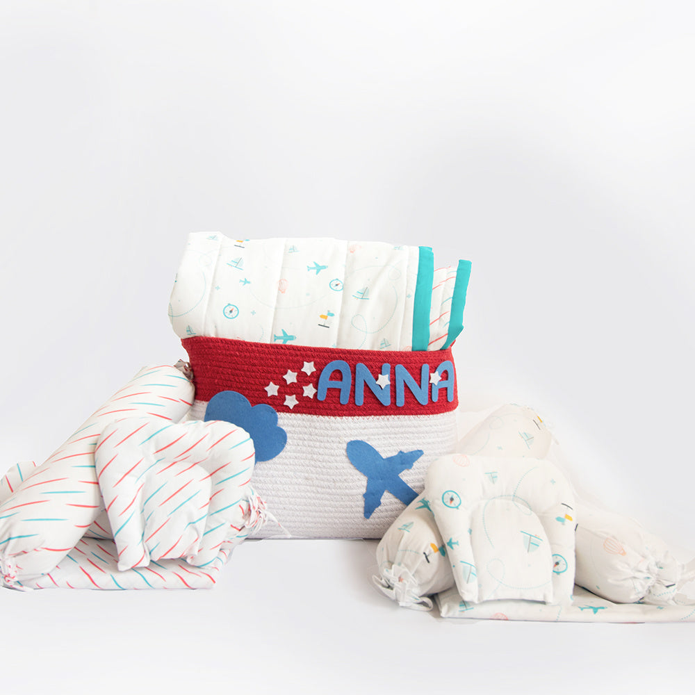 This luxury organic cotton bedding gift basket includes- Adorable cotton storage basket- 1, Oh-So-Cozy Comfort Quilt- 1, Cot Bedsheets- 2, Pillows- 2, Bolsters- 4.