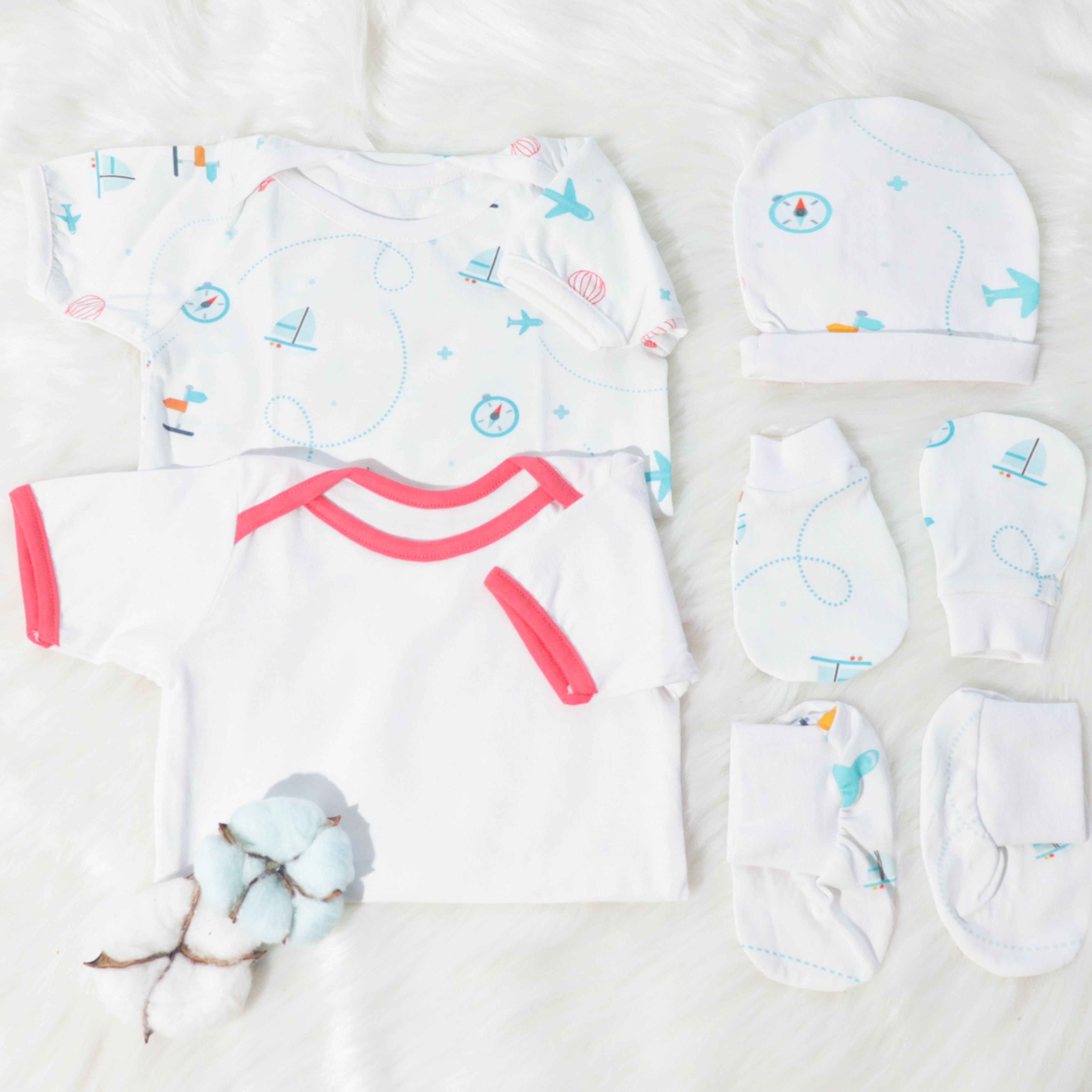 • Set of 7 - 1 cotton cap, 1 pair of mittens, 1 pair of booties, 2 bodysuits.
