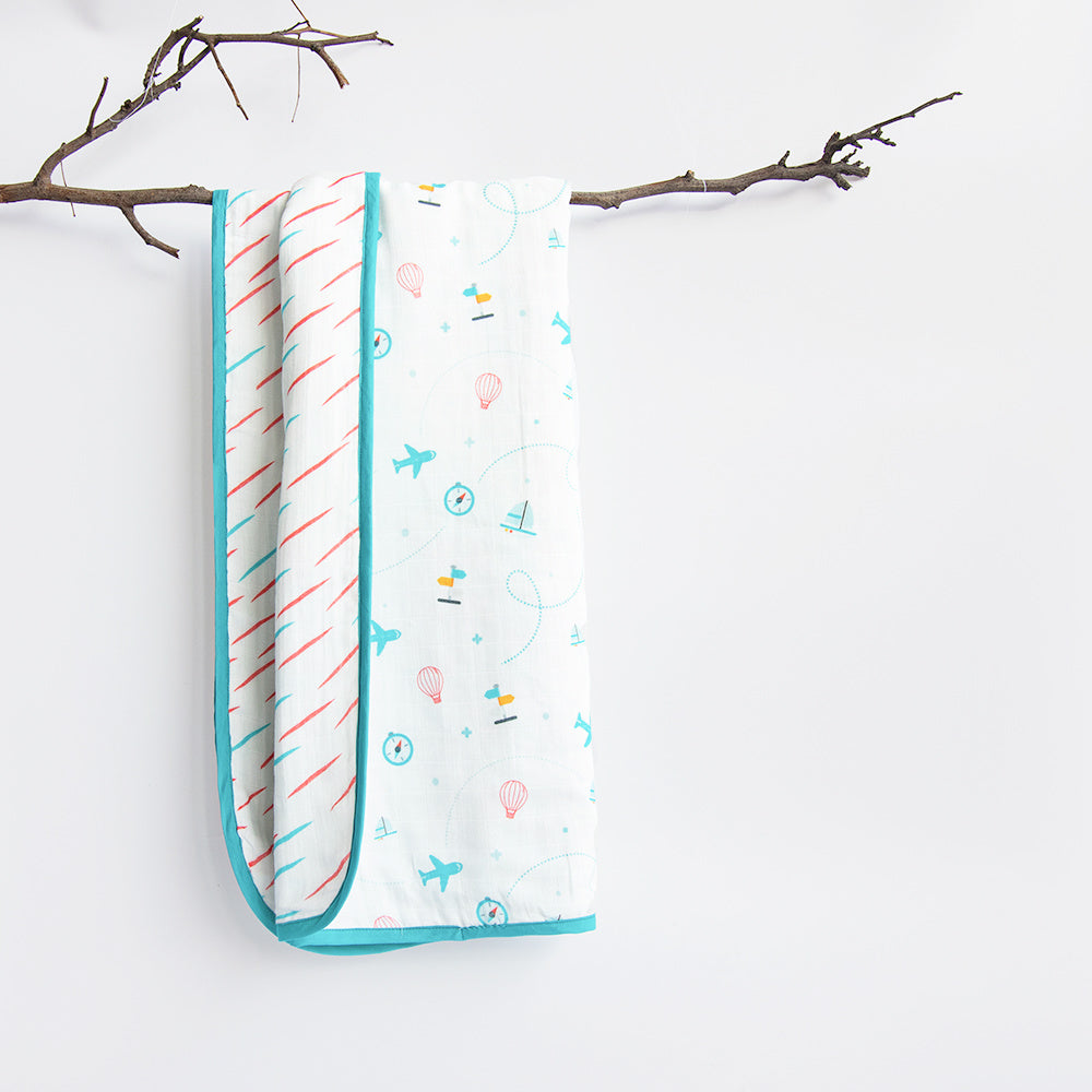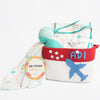 • SIZE & MAKE- 100% Organic Cotton Muslin, perfectly sized with cheerful designs; 1 Reversible Blanket- 110 x 110 cm (3 layers), 1 Swaddle- 105 x 105 cm, 1 Reversible Baby Bib- 37 cm long x 22 cm wide (3 layers), 1 Reversible Burpy Cloth- 60 cm long x 25 cm wide (3 layers), 1 Wipe- 30 x 30 cm (2 layers), 1 Medium Cotton Rope Basket- 30 x 20 x 20 cm, 1 Sensory soft toy, hand-knitted from premium baby wool with integrated rattle sounds- 20 cm length (approx). Hypoallergenic, environment- friendly AZO free dyes. Handmade with care in India.