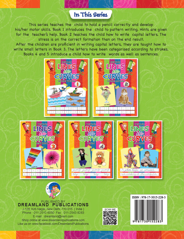 ‘Lines and Curves – Pattern Writing’, this book aims to teach the child to hold a pencil correctly and develop his/her fine motor skills. Carefully designed to help children develop the skills needed for writing, this book includes – • Age-group 2-4, • 32 pages • Lines, curves, slanting strokes, and circles tracing • Step-by-step instructions for proper formation • Revision and Free-expression pages This is a perfect book to help beginner writers develop their essential handwriting skills by practicing tracing on simple dotted lines and curves which they can, later on, practice writing on their own.