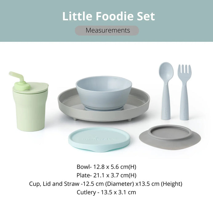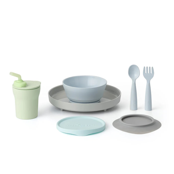 - Miniware Little Foodie All-in-one Feeding Set Plan includes 1 Cassava PLA Cereal Bowl with 1 Silicone Lid, 1 PLA Sandwich Plate, 1 My First Cutlery Spoon & Fork Set, 1-2-3 Sip Cup in PLA with straw, and 1 detachable suction foot.