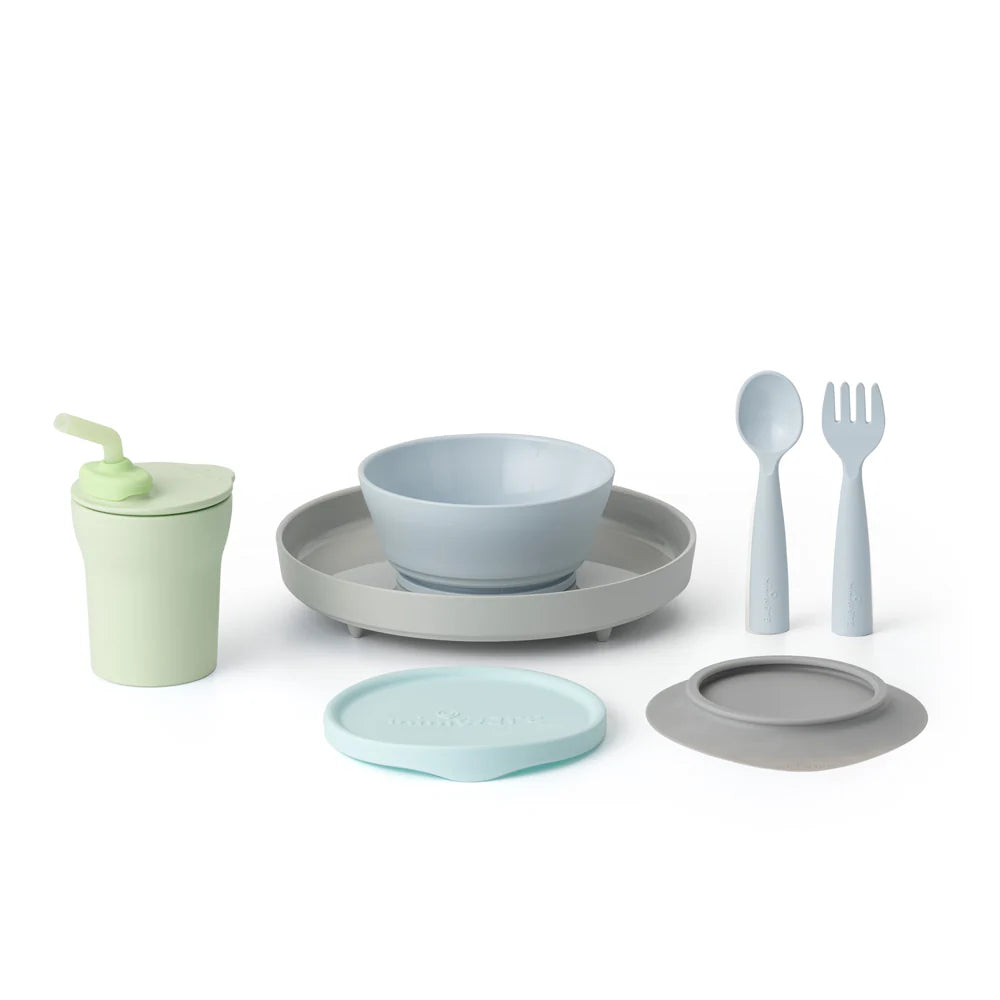 Includes: 1 cereal bowl, 1 silicone lid, 1 sandwich plate, 1 my first cutlery set, 1 1-2-3 sip cup with silicone straw, and 1 detachable suction foot.