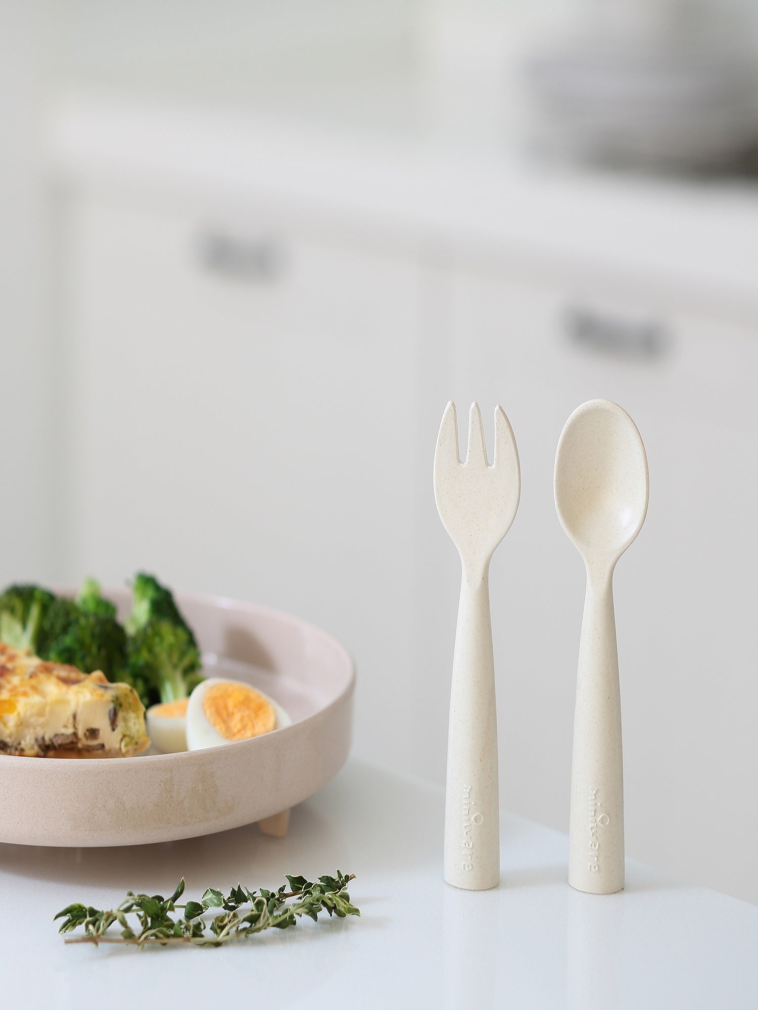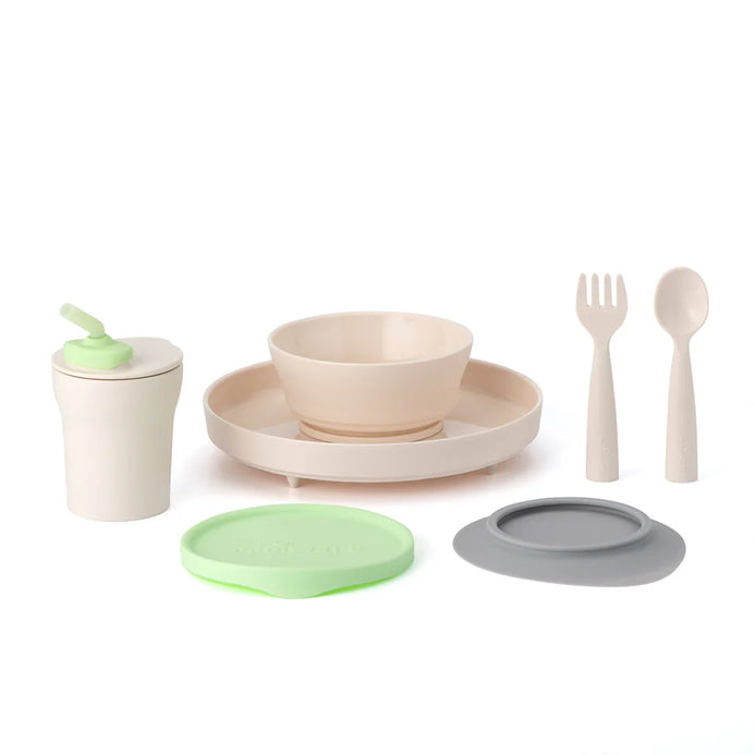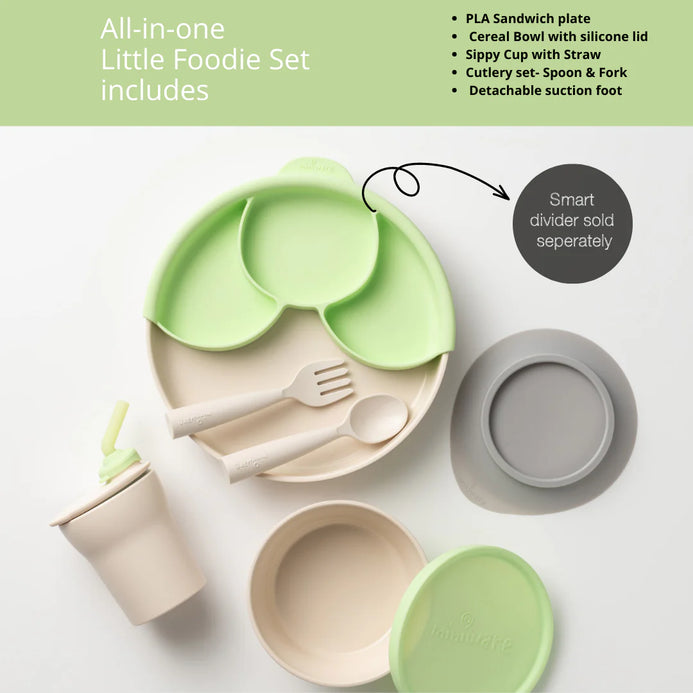 - Miniware Little Foodie All-in-one Feeding Set Plan includes 1 Cassava PLA Cereal Bowl with 1 Silicone Lid, 1 PLA Sandwich Plate, 1 My First Cutlery Spoon & Fork Set, 1-2-3 Sip Cup in PLA with straw, and 1 detachable suction foot.