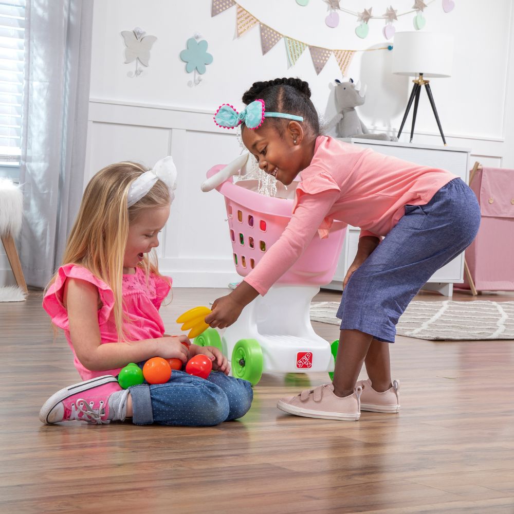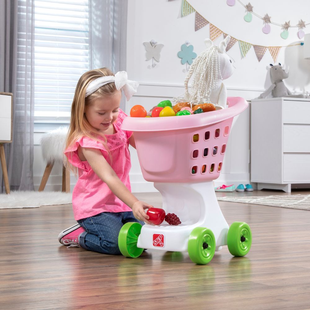 - Lightweight design, large handles, and smooth molded wheels let toddlers push this grocery cart easily.