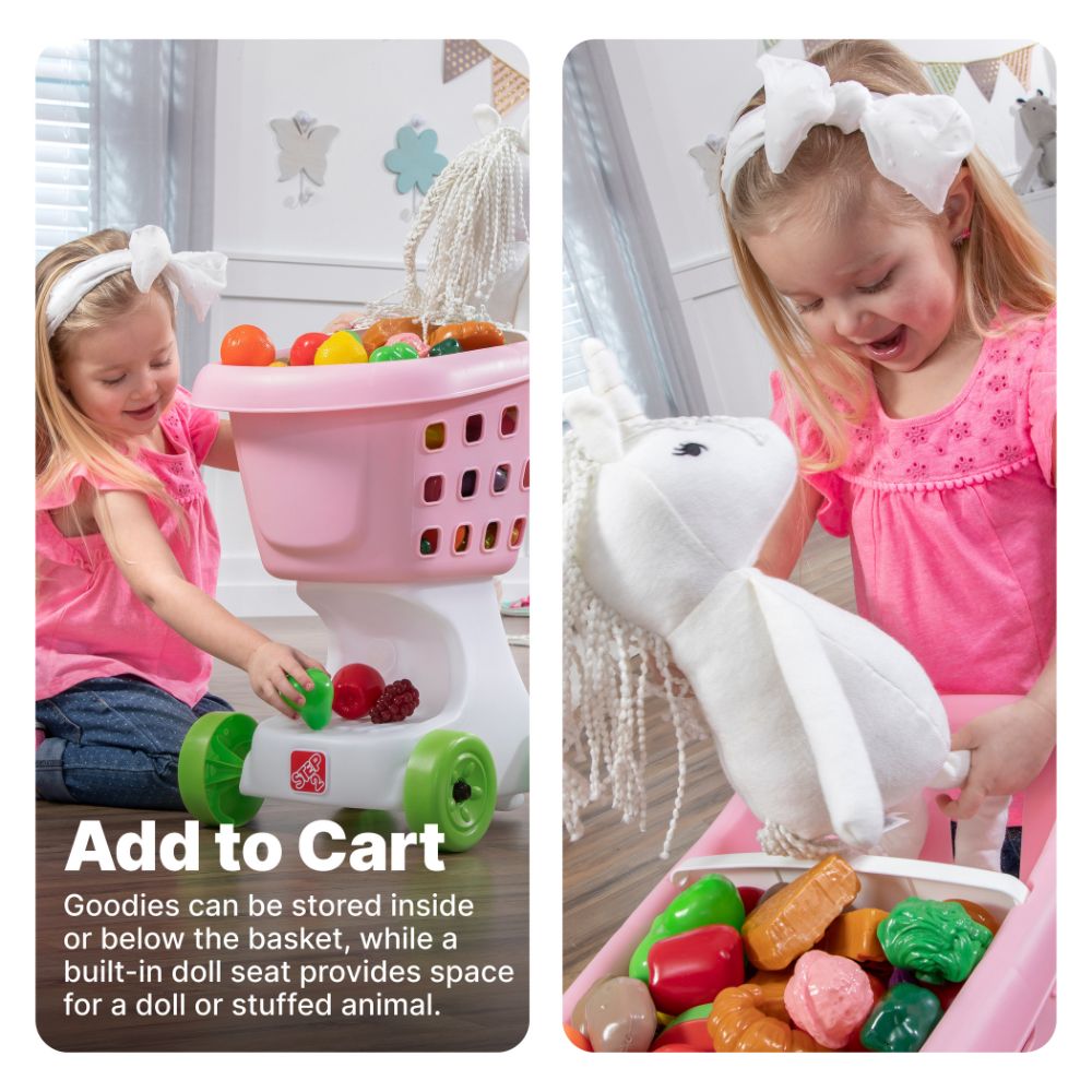 - Toddlers can take their favorite stuffed animal friend along for the ride in the shopping cart’s doll seat.