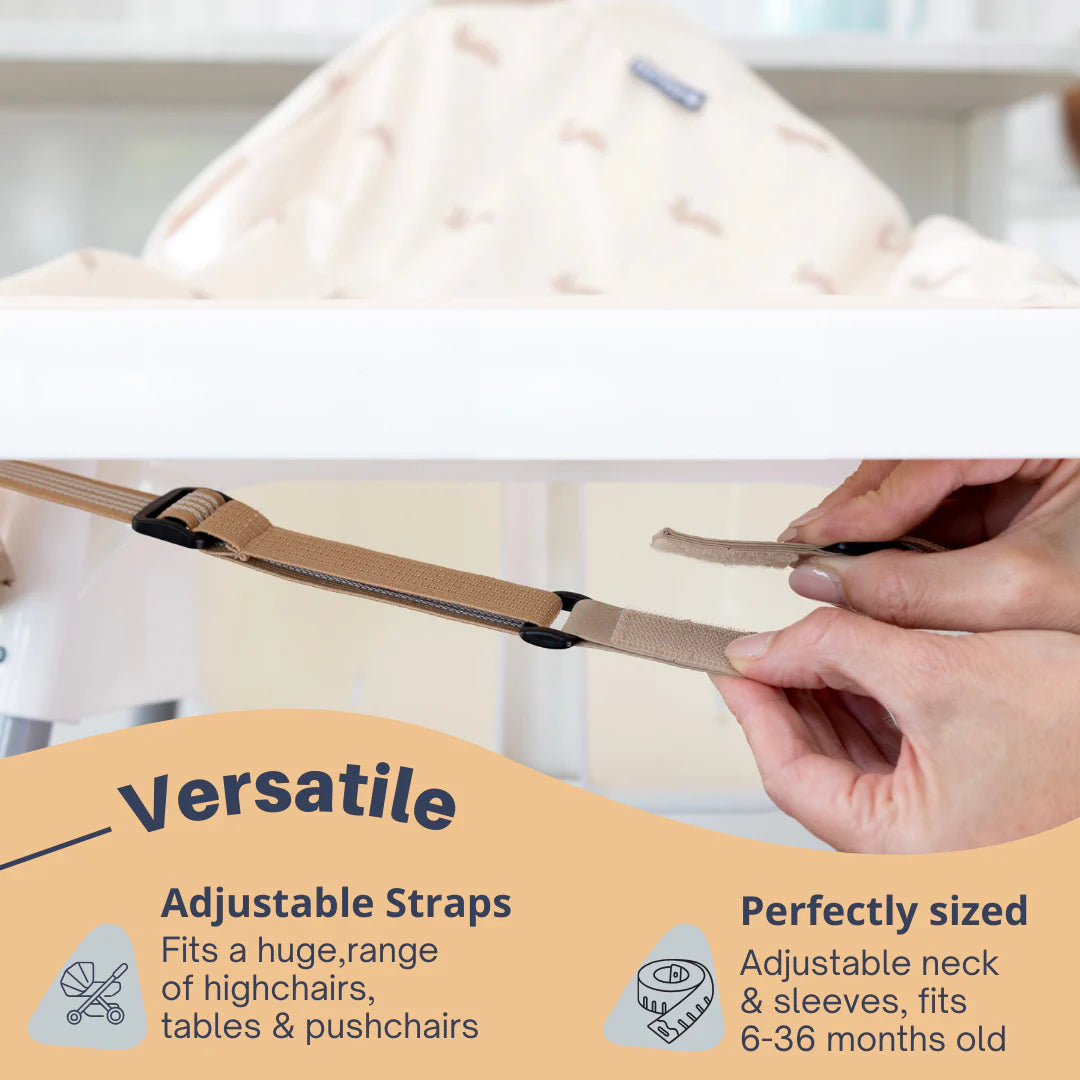 - Convenient, Adjustable Sleeve Bib - Our adjustable toddler bib fits any highchair perfectly, with or without trays. Simply attach your versatile high chair bib to prams and tables to keep your child neat, clean, and dry when eating.