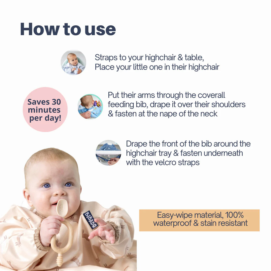 - Supports Your Child’s Self-Feeding Skills - Our coverall feeding bibs are compatible with BIBaDO Handi Cutlery. It comes with ‘no drop’ straps, so you won’t have to pick up spoons & forks from the floor while your little one learns how to use them. (Handi Cutlery are sold separately)