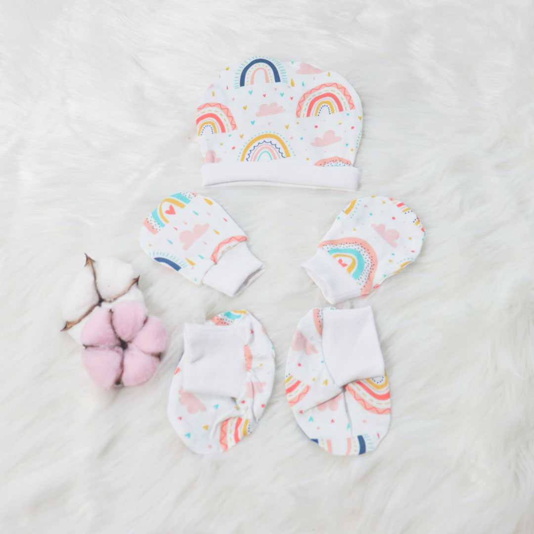 Each piece is not only made with premium cotton, but also features flat seam stitching so that thereàno irritating inner seams, non-toxic printed labels means thereàno itchy tags, double stitching ensures durability and comfy enough as your baby grows. Made of 100% cotton, beautiful colours and adorable designs; this cap, mittens & booties set will keep your baby safe and fashionable.