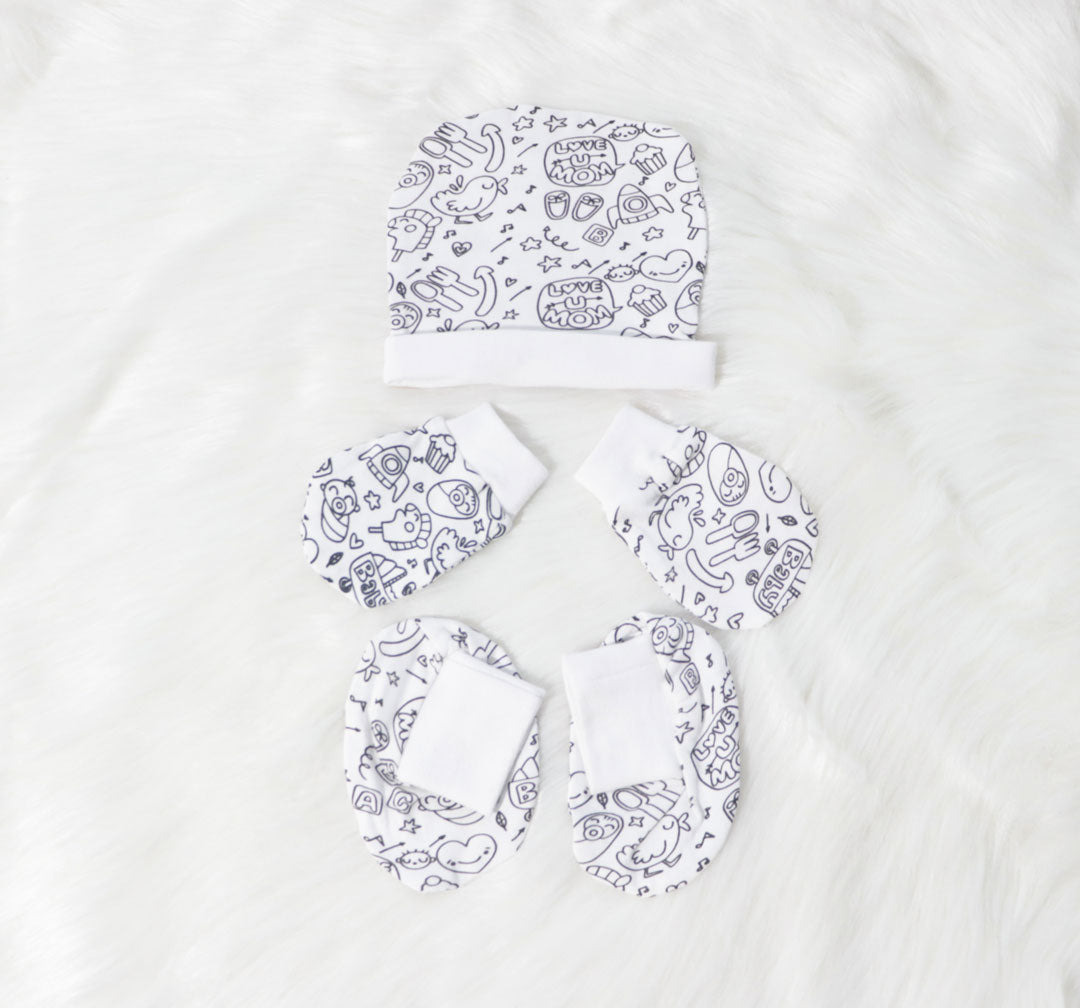 Each piece is not only made with premium cotton, but also features flat seam stitching so that thereàno irritating inner seams, non-toxic printed labels means thereàno itchy tags, double stitching ensures durability and comfy enough as your baby grows. Made of 100% cotton, beautiful colours and adorable designs; this cap, mittens & booties set will keep your baby safe and fashionable.
