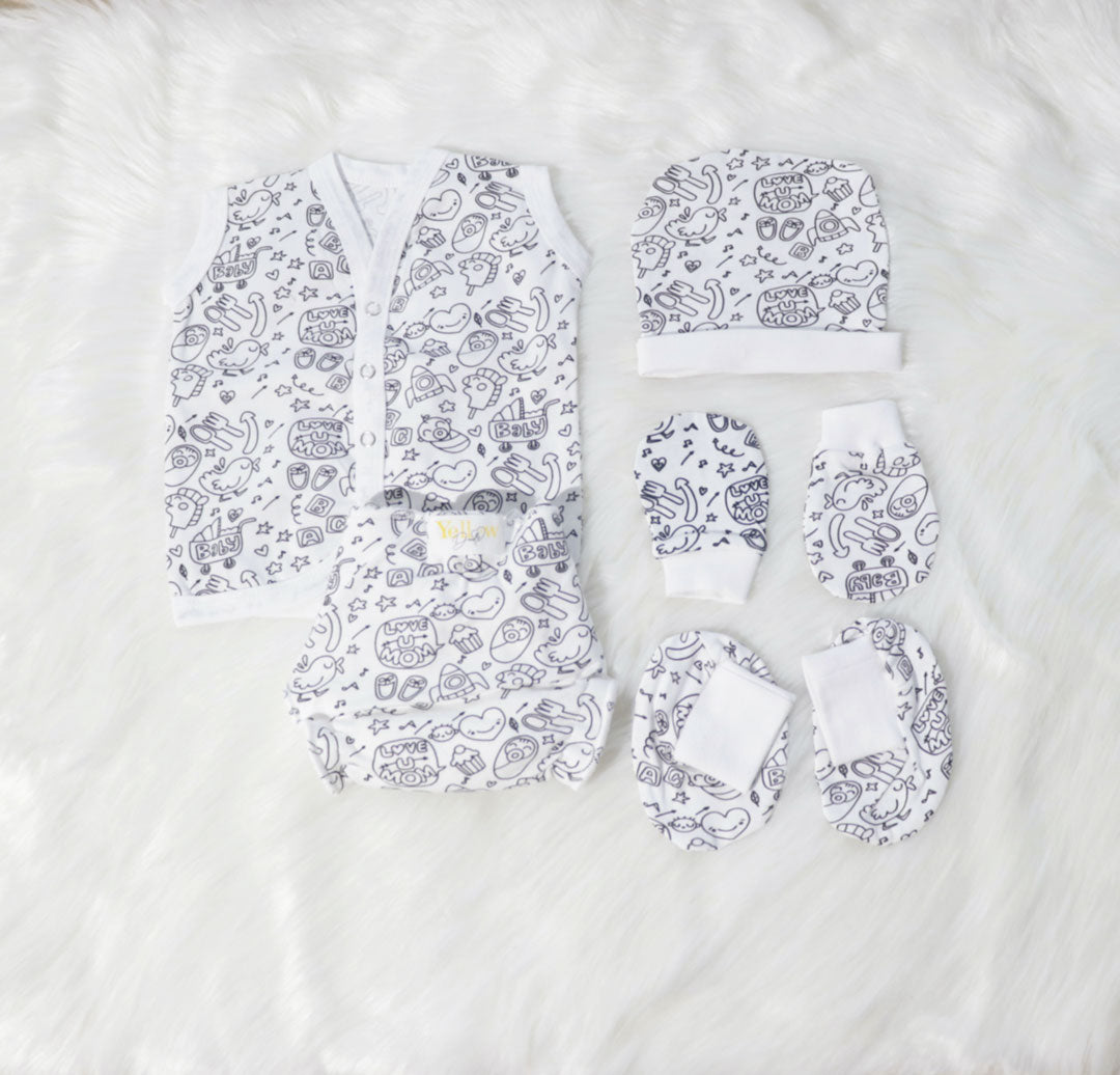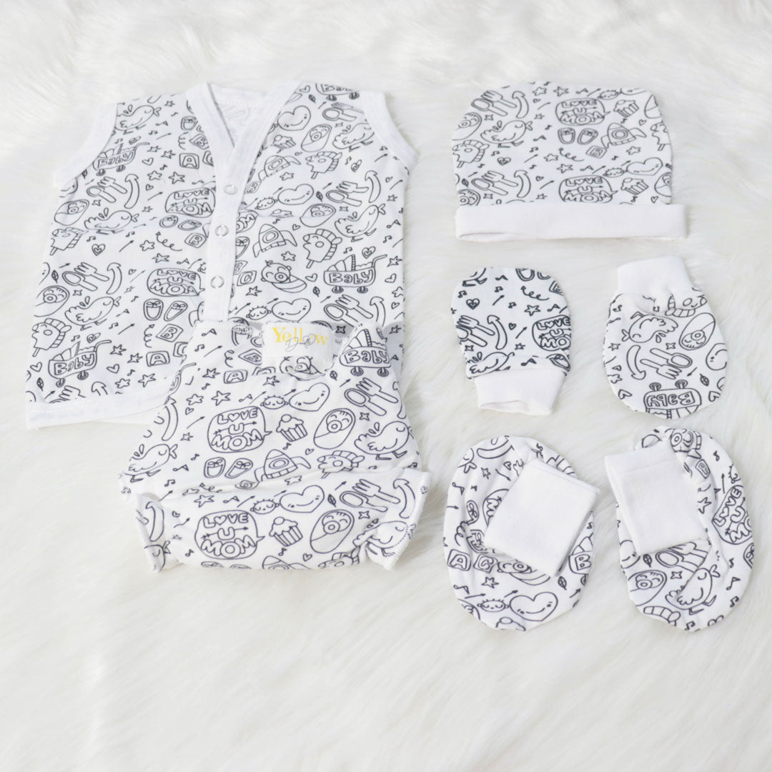 Yellow DoodleàNewborn Everyday Essentials (set of 7) is ethically made using the finest cotton and is printed with chemical free dyes, a safer choice for our environment and for your baby. At Yellow Doodle, we care about how your baby feels in anything they wear, hence we only choose soft and breathable fabrics.