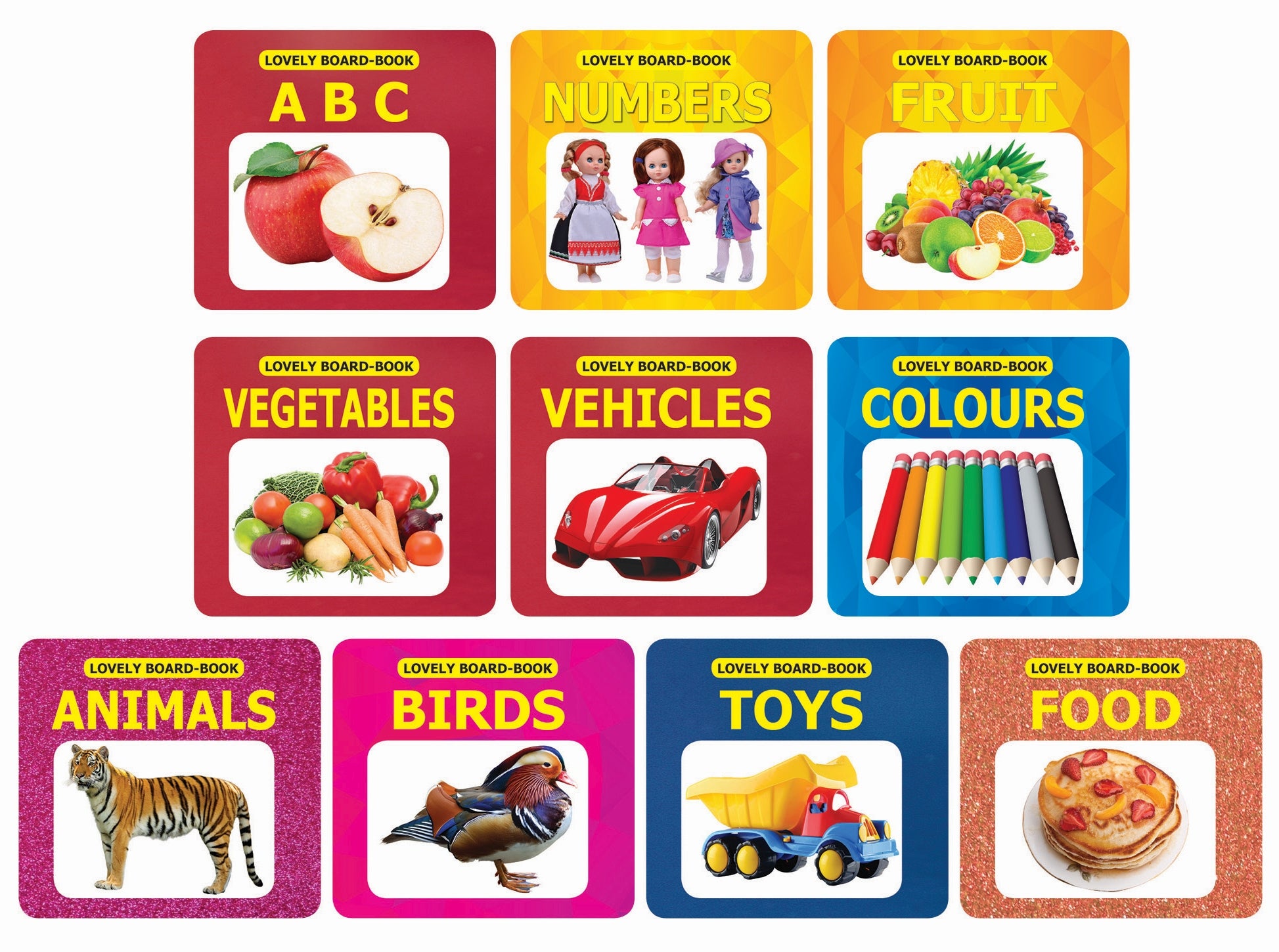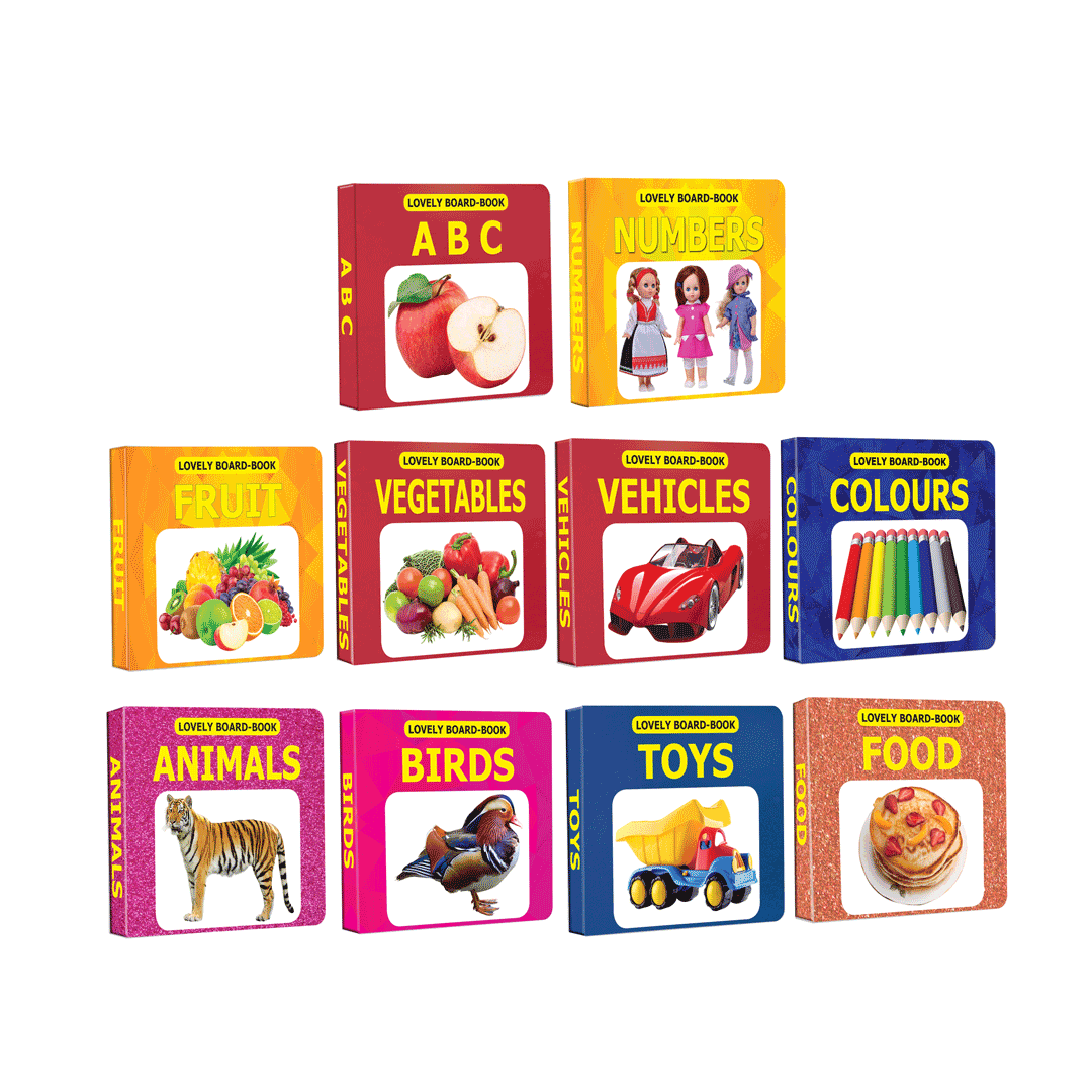 An ideal gift pack for growing kids contains ten books on early learners’ topics – ABC, Numbers, Fruit, Vegetables, Vehicles, Colours, Animals, Birds, Toys, and Food. A variety of content adorned with dazzling pictures will keep the babies busy and happy. • Suitable for age-groups 0-2 years • Perfect size for toddlers • Splendid images • Sparkling cover • Hardbound Useful and handy lovely little books of this gift pack are helpful for little learners as they learn words on ten different topics. These books will encourage tiny tots’ love for books.