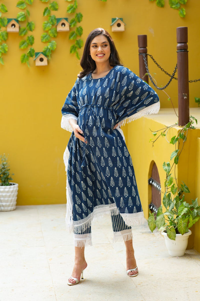 Momzjoy's luxurious yet super comfy nursing kaftan set features beautiful lace and tassel detailing. Made in soft breathable cotton block print and cut for a relaxed fit, this set falls beautifully over your curves allowing space for movement.