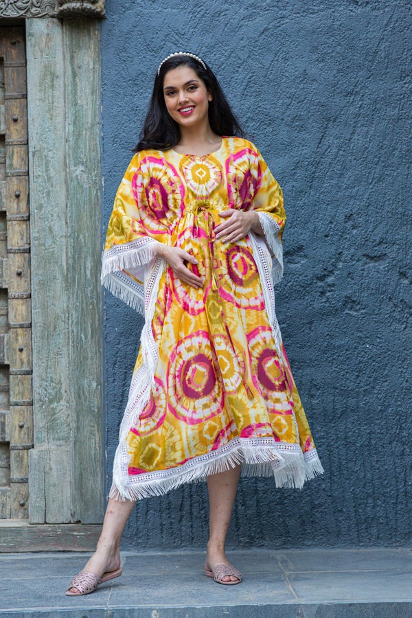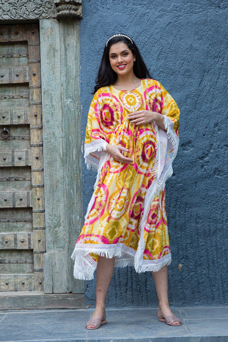 Try Momzjoy's super relaxed fit nursing kaftan for relaxed feeding at odd hours. Made in soft breathable crepe and cut for a comfy fit, this kaftan falls beautifully over your curves allowing space for movement.
