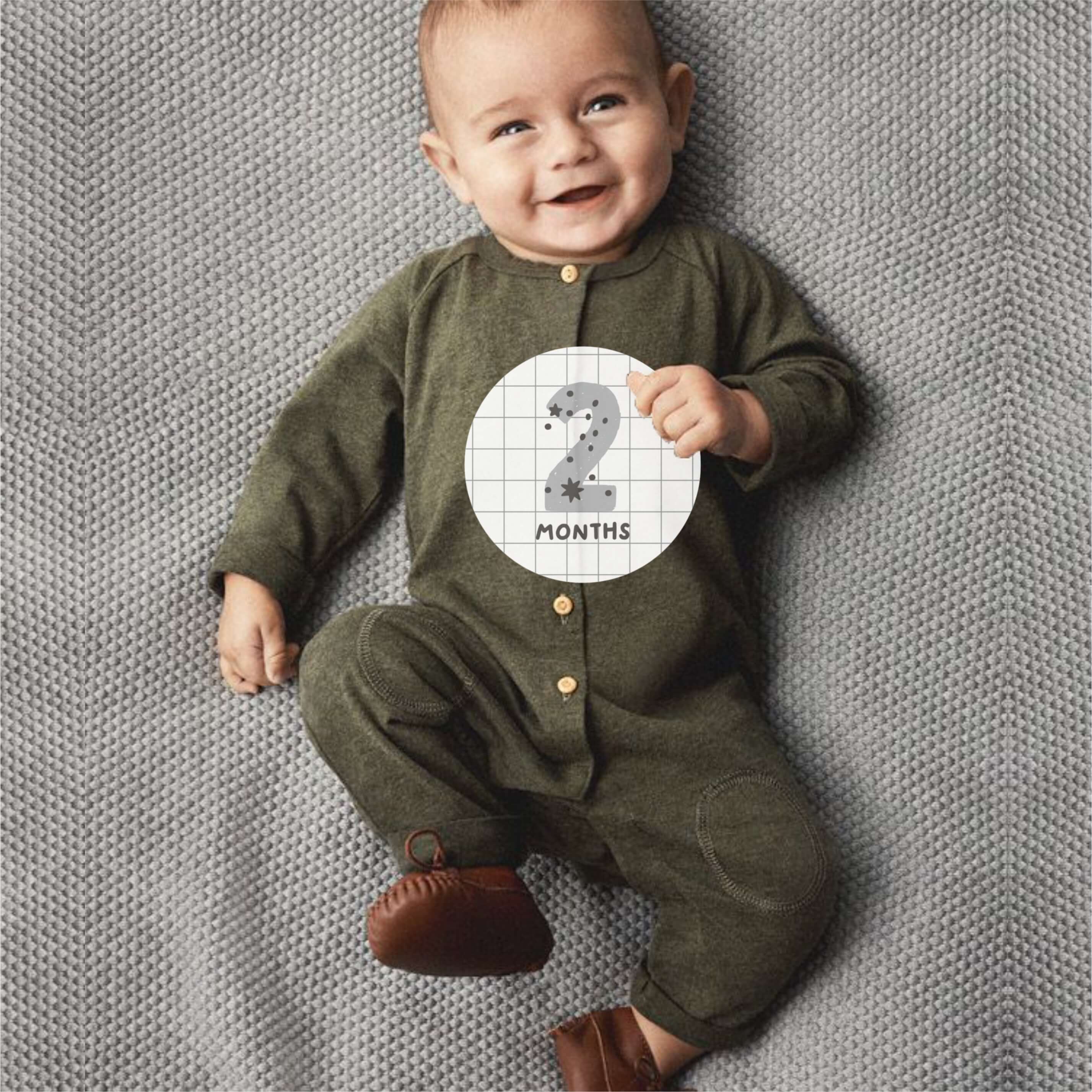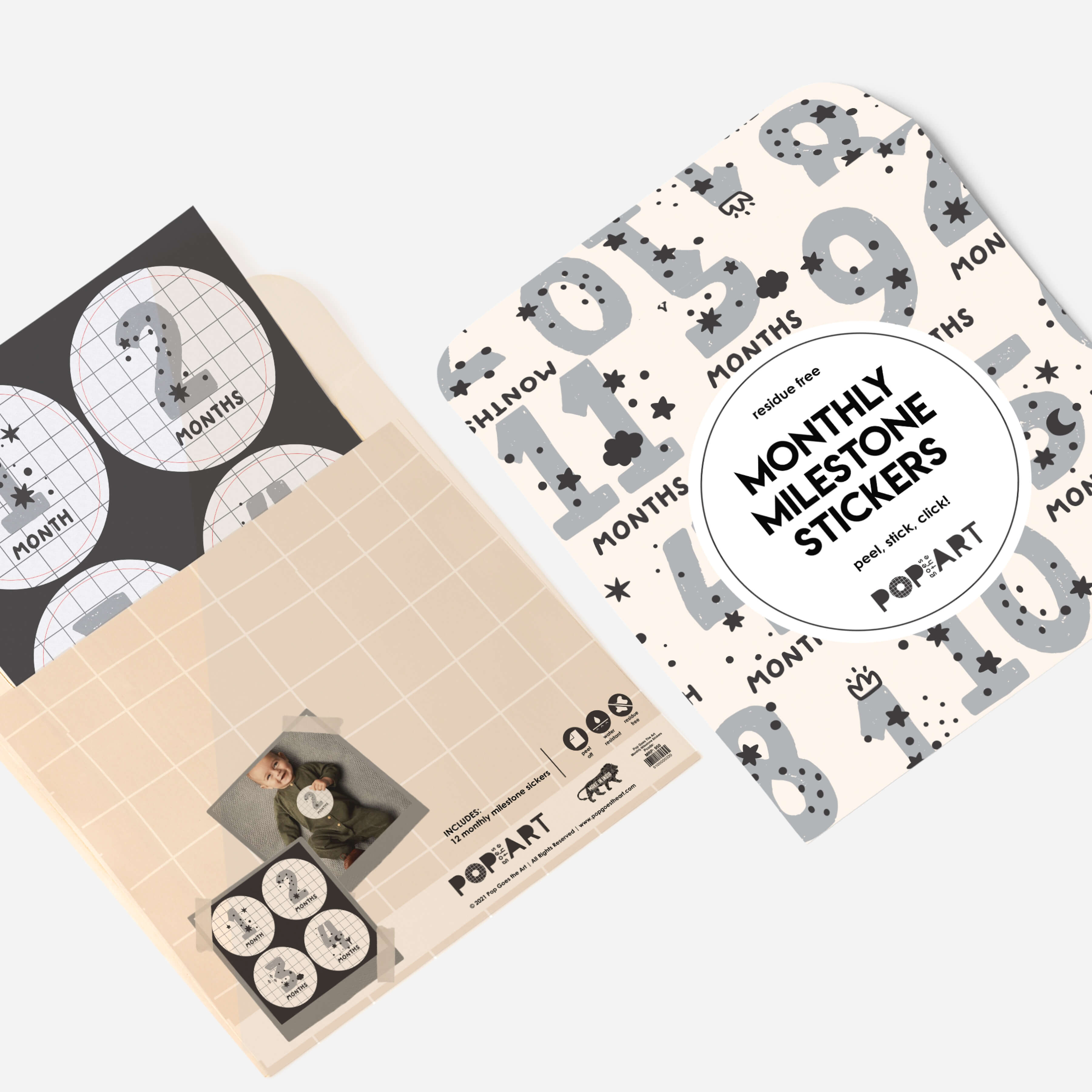 "- 12 stickers from 1 month to 1 year - Residue free so saves your clothes! Monochrome so it matches every backdrop!