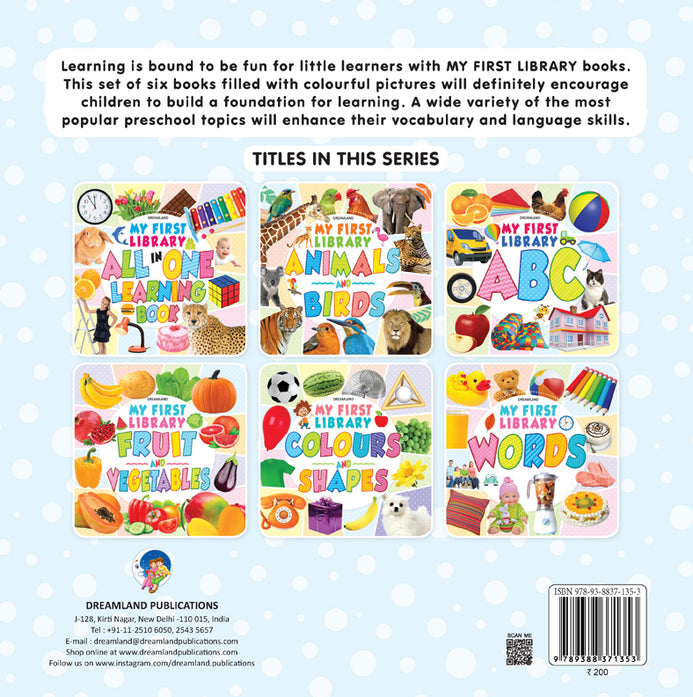 Learning is bound to be fun for little learners with ‘MY FIRST LIBRARY BOOK – WORDS’. This book stuffed with colourful pictures will definitely encourage children to build a foundation for learning and a wide variety of the most popular preschool topics will enhance their vocabulary and language skills. • Ideal for age-group 1-4 • 16 colourful pages • Cute cover design • Colourful presentation From the parts of the body to birthday party and from food to vehicles and stationery products, this book highlights ample words each clearly labelled with pictures of the object. This makes it easy for kids to memorise and identify the objects’ names. This book is indeed an important resource for developing language for early learners.