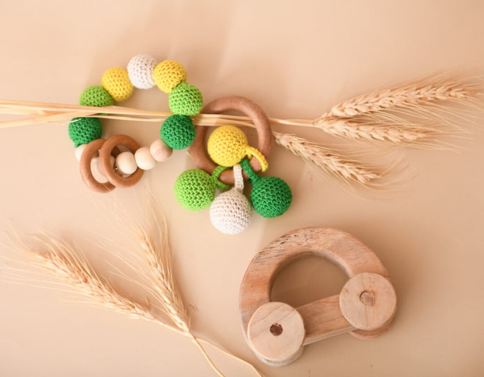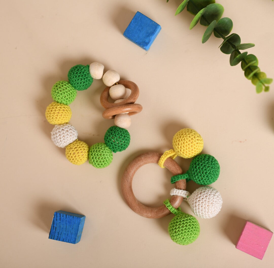 WOODEN RATTLE AND TEETHER WITH CROCHET BEADS IS A CAPTIVATING TOY DESIGNED SPECIFICALLY TO STIMULATE YOUR CHILD AND ENSURE TO CAPTURE AND SLOWLY HELP THEM FOCUS THEIR ATTENTION TOWARDS THE SOUND. CRAFTED WITH UTMOST CARE AND ATTENTION TO DETAILS, THIS DELIGHTFUL TEETHER AND RATTLE OFFERS A PERFECT COMBINATION OF FUNCTIONALITY, SAFETY AND AESTHETIC APPEAL. THESE WOODEN RATTLE IS A GOOD GRASPING AID AND VERY SAFE FOR YOUR BABIES.
