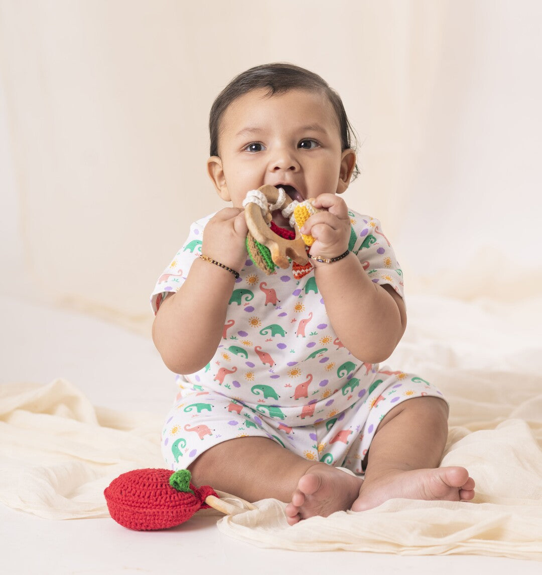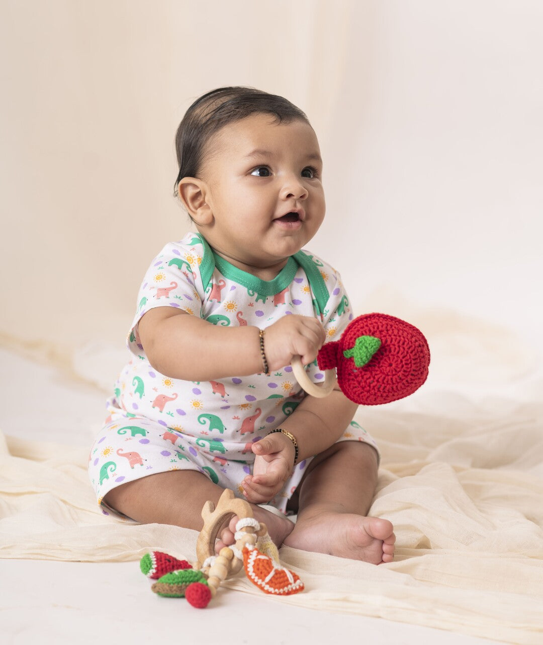 WOODEN RATTLE AND TEETHER WITH CROCHET BEADS IS A CAPTIVATING TOY DESIGNED SPECIFICALLY TO STIMULATE YOUR CHILD AND ENSURE TO CAPTURE AND SLOWLY HELP THEM FOCUS THEIR ATTENTION TOWARDS THE SOUND. CRAFTED WITH UTMOST CARE AND ATTENTION TO DETAILS, THIS DELIGHTFUL TEETHER AND RATTLE OFFERS A PERFECT COMBINATION OF FUNCTIONALITY, SAFETY AND AESTHETIC APPEAL. THESE WOODEN RATTLE IS A GOOD GRASPING AID AND VERY SAFE FOR YOUR BABIES.