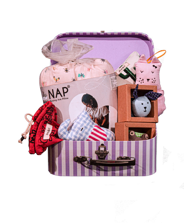 - Special curated box with items below: -Nursing Arm Pillow -Baby saftey brooch. -The cushy door latch cushion. -washable travel kit. -Easy grip elle plush toy. - Two wrist rattles. -Muslin plush napkin.