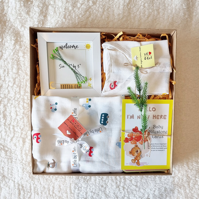 • It includes 1 Swaddle, 1 Jhabla, 1 Photo Frame and 9 Milestone Cards
