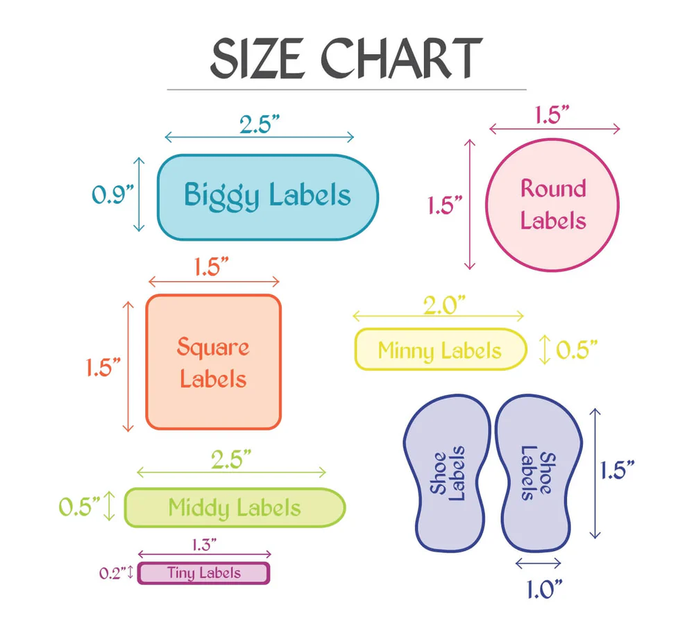 Complete Pack (154 Labels + 1 Bag Tag): 8 Round | 8 Square | 6 Shoe | 36 Minnies | 20 Middies | 12 Biggies | 40 Tinnies | 20 Iron Ons | 1 Complimentary Bag Tag