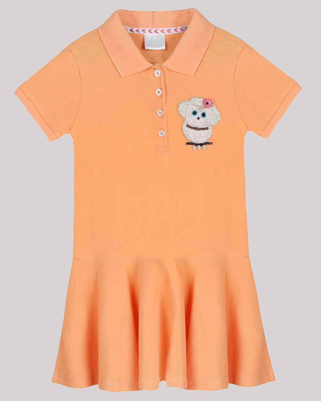 Peach Polo Dress With Drop Waist Silhouette And Hand-Embellished Owl Motif