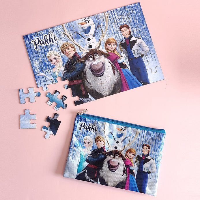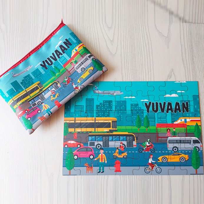 Our personalized jigsaw puzzle is made of MDF and comes with a personalized waterproof pouch.It comes in 3 sizes and can entertain the kid for hours. Size of the puzzle is 16*11 inches and size of the pouch is 12*8 inches.