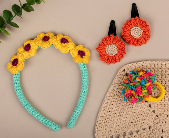 Introducing our delightful collection of crochet hair accessories for kids! Designed with playful charm and comfort in mind, each piece is handcrafted to add a touch of whimsy to your little one's hairstyle. From vibrant flower clips to adorable headbands, our crochet accessories are perfect for adding a pop of color and personality to any outfit. Made with soft, child-friendly materials, they are gentle on delicate hair and skin, ensuring your little trendsetter stays stylish and happy all day long. Explore our enchanting range and let your child's imagination soar with our fun and fabulous crochet hair accessories.
