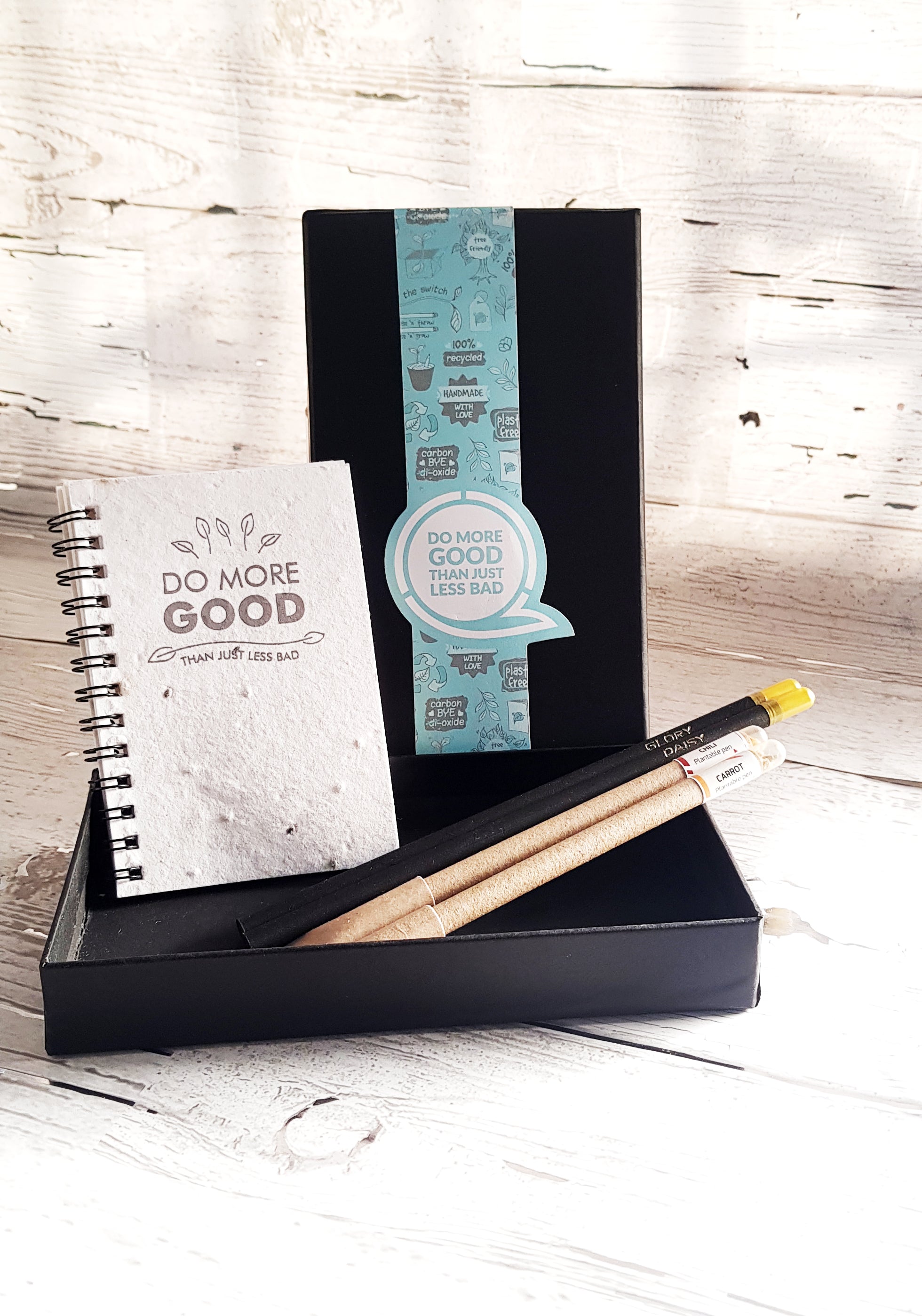 This Box Contains: PLANTABLE STATIONARY - 2 Plantable paper Pens with coloured ink, 2 Plantable pencils, 1 Plantable Notepad