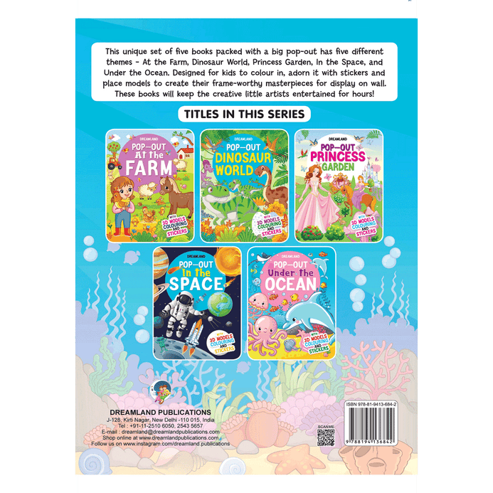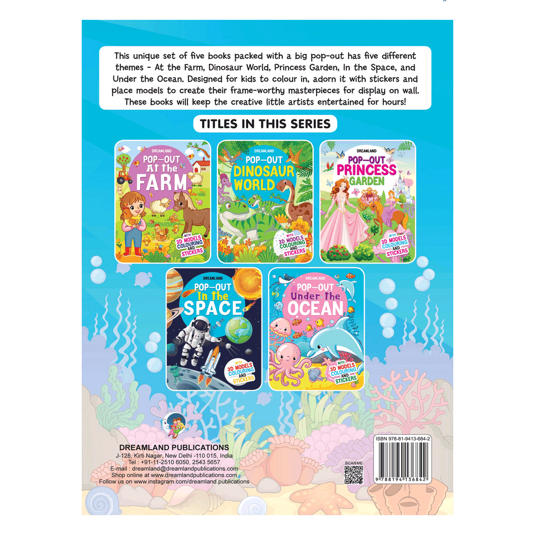 Designed for kids to colour in, adorn it with stickers, and place models to create a frame-worthy masterpiece for display, ‘Pop-out – Under the Ocean’ book will keep the creative little artists entertained for hours. • Ideal for age-group 4-10 • Instructions given • Two pages of bright stickers • One large paper sheet having images of the ocean world • Die-cut 3-D models A perfect book to encourage hand-eye coordination and visual perception skills, this is a wonderful gift for kids to enhance their creativity and imagination.