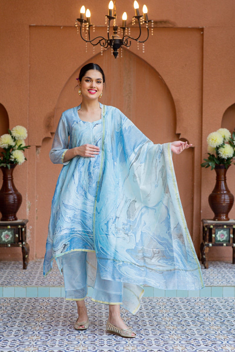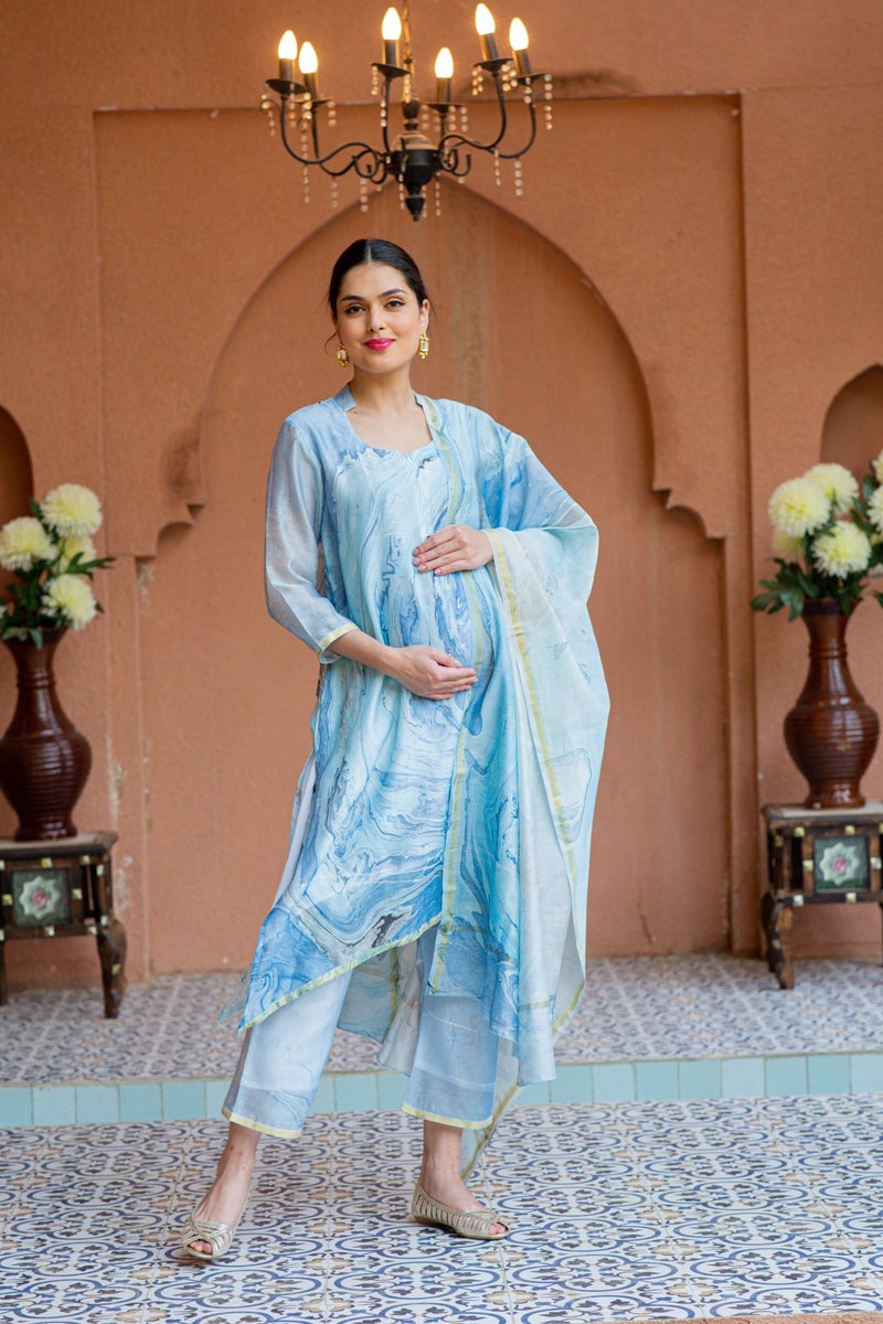 Premium Luxe Arctic Blue Chanderi Maternity & Nursing Kurta + Bump Band Bottom + Dupatta