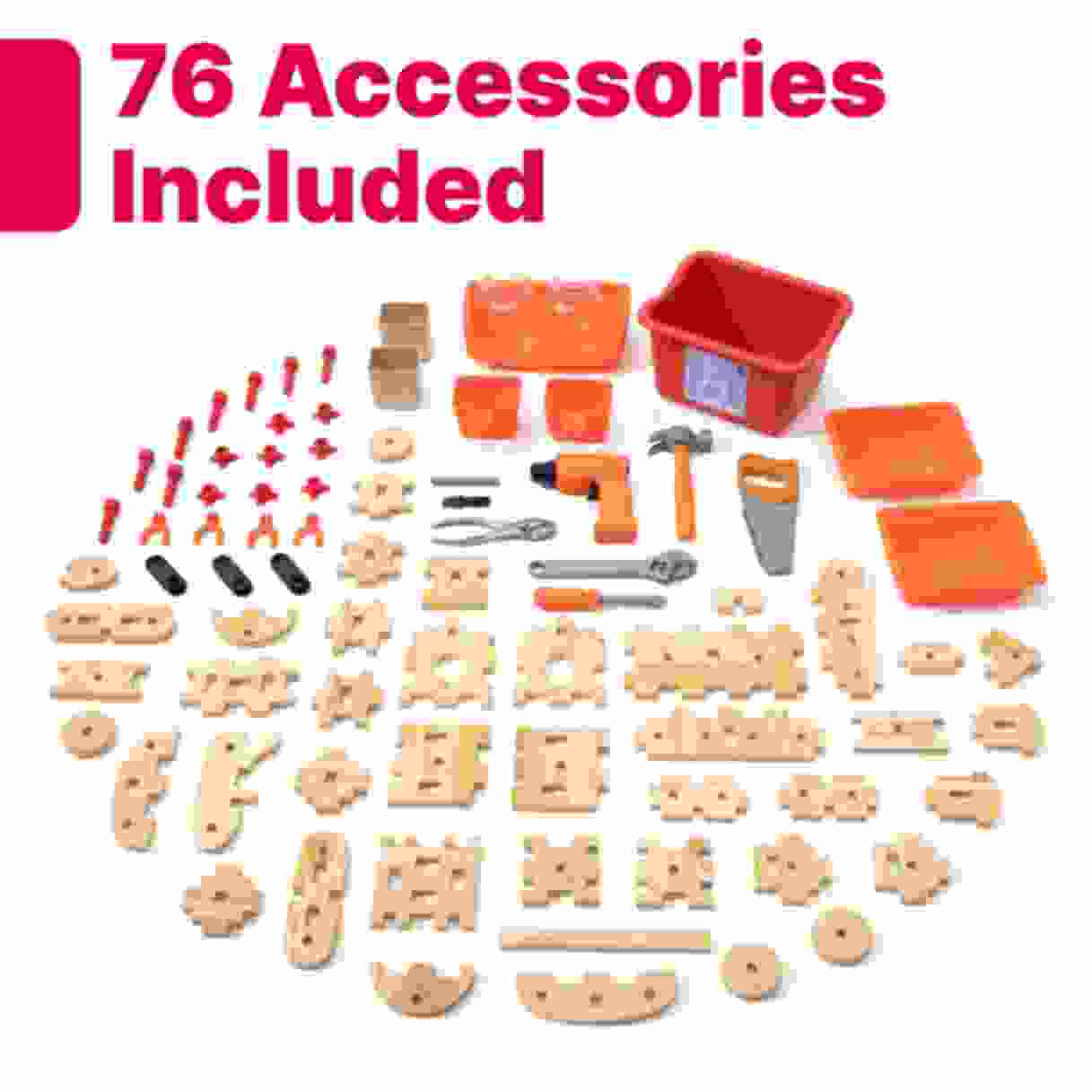 • STEM TOY: Table saw, ruler, storage shelves, a project kit made of foam wood, an electric play drill (batteries not included), 75 piece toy accessory set