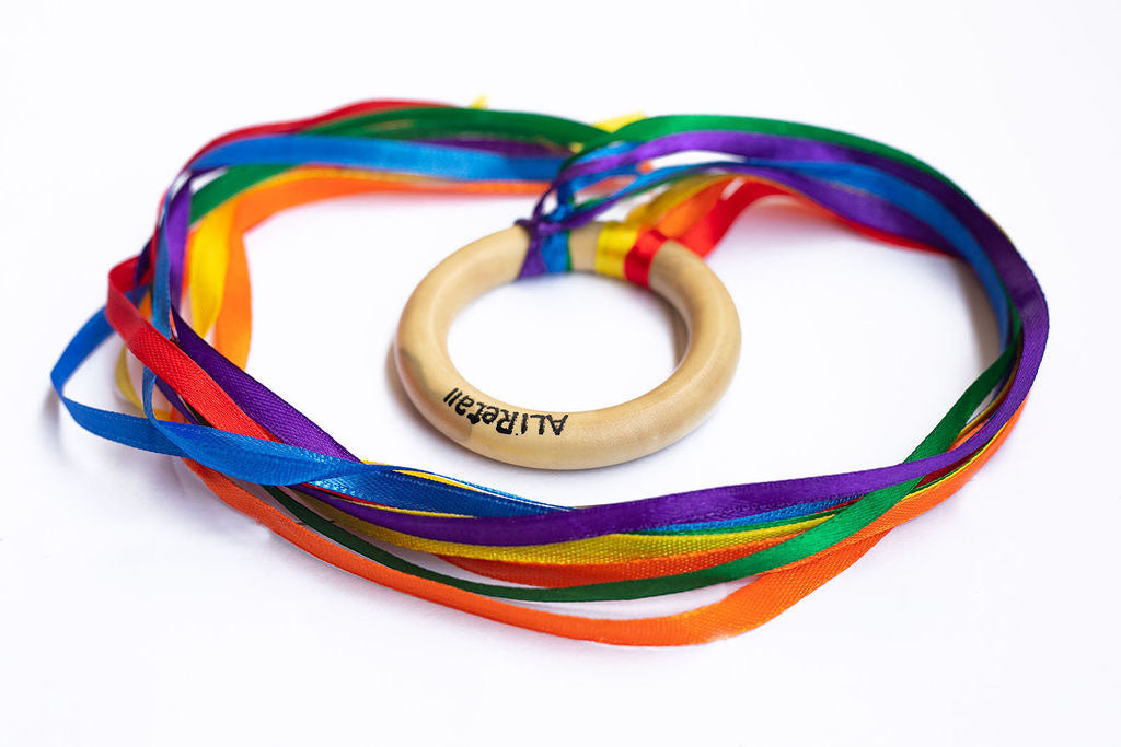 Each ring is 7 cm wide and has 6 colors of ribbons tied on it. Tied length is 20" for each strand and available in two width options - 0.25 and 0.5 Inch. This hand kite features ribbons in red, orange, yellow, blue, green and purple.