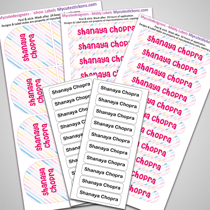It’s a small pack of assorted labels for your few days of camping baggage needs, The Iron On Clothing Labels, Shoe Labels and minnies are all a part of this pack. It's great for starters too, who wish to try our labels. The pack contains 15 iron-on, 2 pairs of shoe labels, 20 Medium labels.