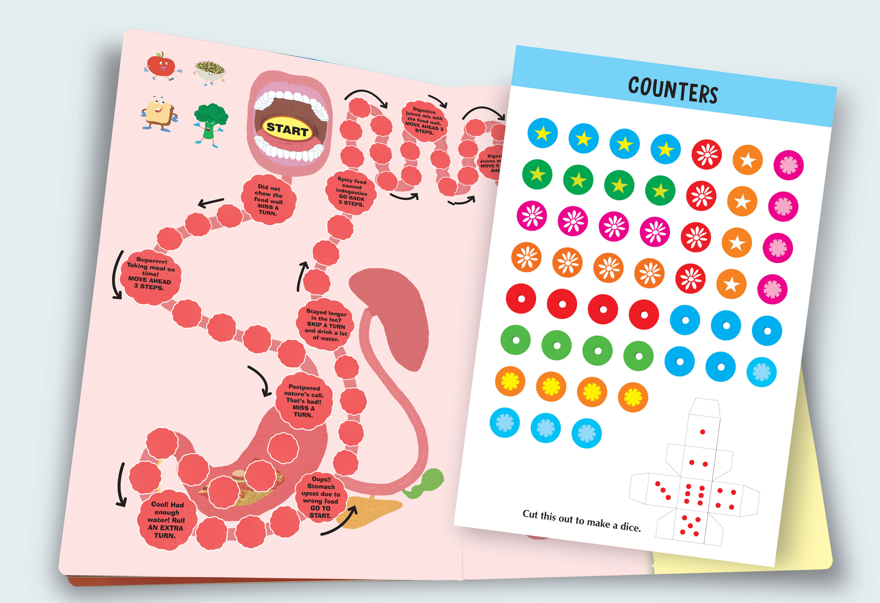 Looking for some learning based games but unplugged and screen free? Here it is! A multipurpose book with gamified learning! It includes dice and counters. This games book could be used for a group activity and learn simple science concepts such as Force and friction, Photosynthesis, the digestive system and more. What more? It can be a good tool for some play-based, interactive learning time and bonding too!
