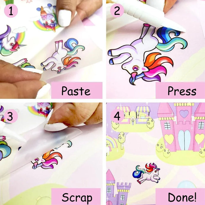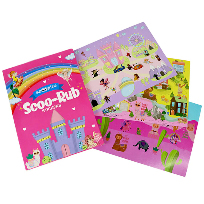 This pack of Scoo-Rub transfer stickers comes with 3 fairyland, dreamland and desert land scenes, over 100+ stickers that engage kids in narrative thinking and help in learning cause and effect. Peel and stick activity also refines motor skills and improves focus and concentration. Position the stickers, rub with a stylus being provided and stickers will blend in the scene.