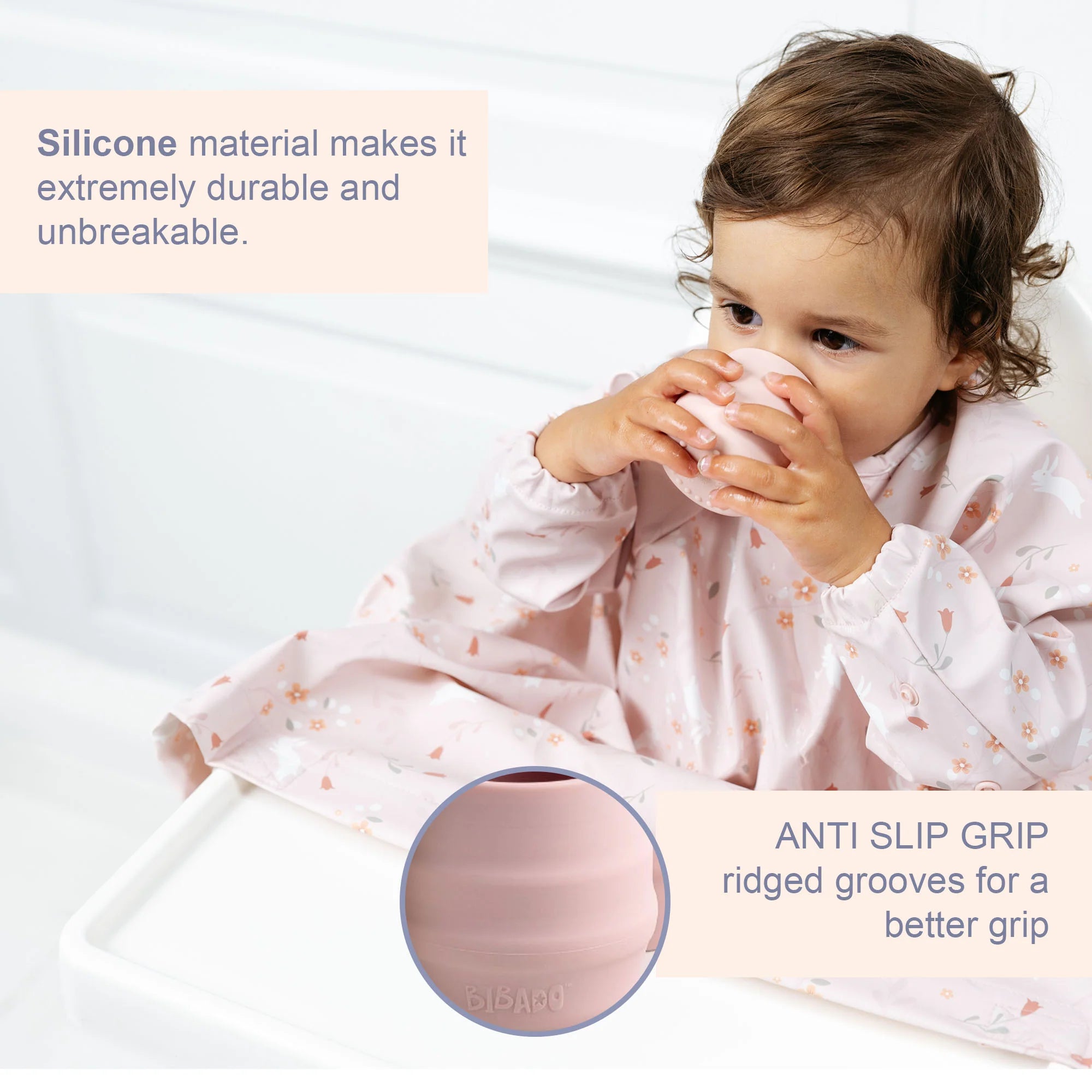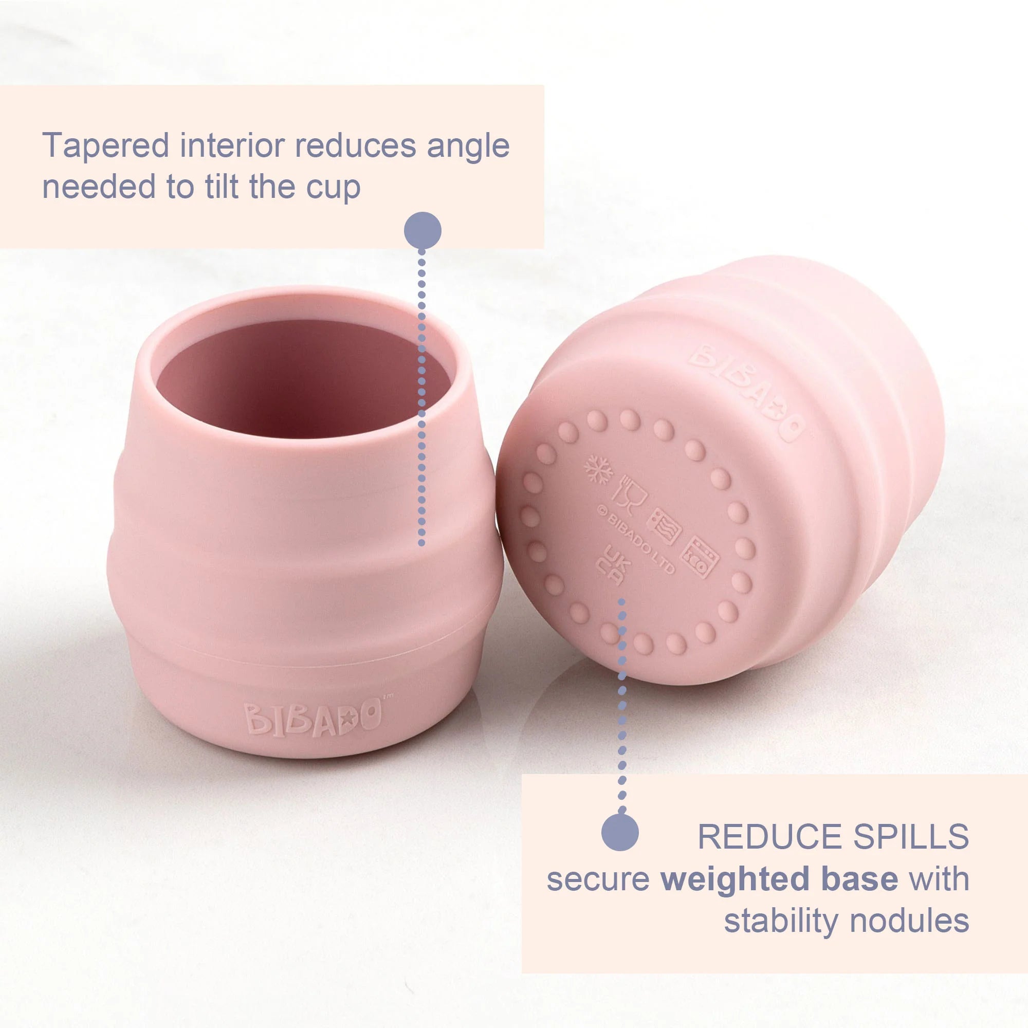 Baby-safe medical-grade silicone is soft on delicate little mouths and protects developing teeth. The Sippit™ baby training cup is designed to support a stable grasp between two hands and encourages lifting using both arms into the centre line of motion. A weighted base and grippy nodules minimise toppling and make it easier for babies to set the silicone cup down. The Sippit™ open training cup is tapered inside to reduce the angle needed to tilt it, making it easier for the baby to reach their mouth.
