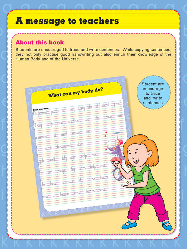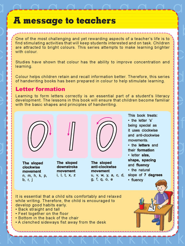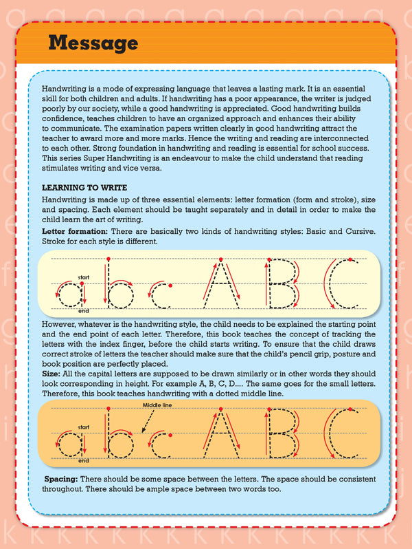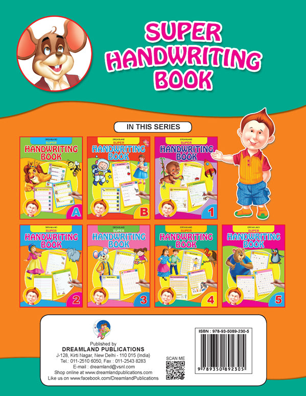 Great educational complement for primary school children ‘Super Handwriting Book’ is a fun and innovative resource to teach kids writing each letter of the alphabet, combining letters to make words, and forming sentences with easy-to-follow directions. This is the perfect starting book to give beginner learners a head-start with 60+ pages of tracing practice. • Ideal for age-group 3-5 • 64 pages • Cute cover design • Colourful presentation Organised in a progressive skill-building way this amazing handwriting practice book will help children develop their confidence to write neatly and improve their hand-eye coordination and motor skills. ?