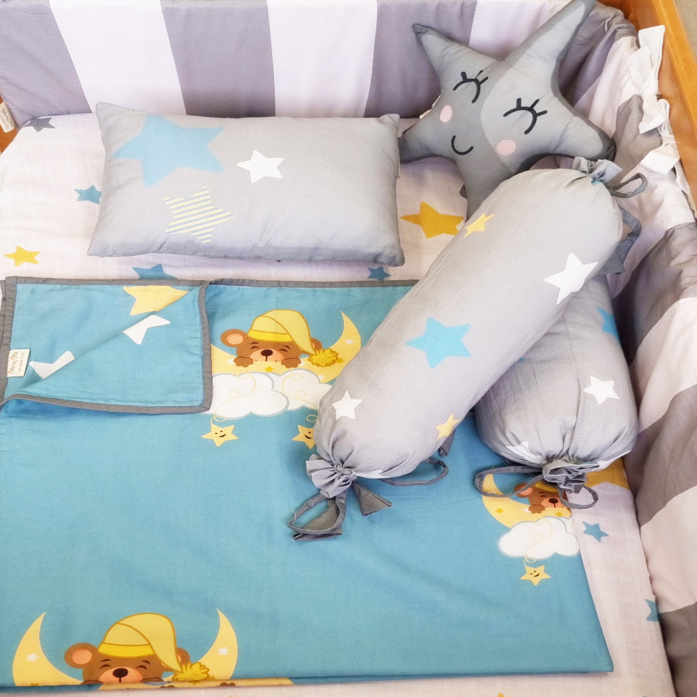 • 1 Cot fitted sheet fits mattress 27.5 x 55 (70 x 140cm) upto 6 deep and has an elastic all around the edges for a secure fit, 1 Baby Cotton Pillow 9 x 12, 2 Bolsters 14 x 18, 1 Dohar Blanket 40 x 40, 1 Star Plush Pillow Approx 11.5 x 11.5