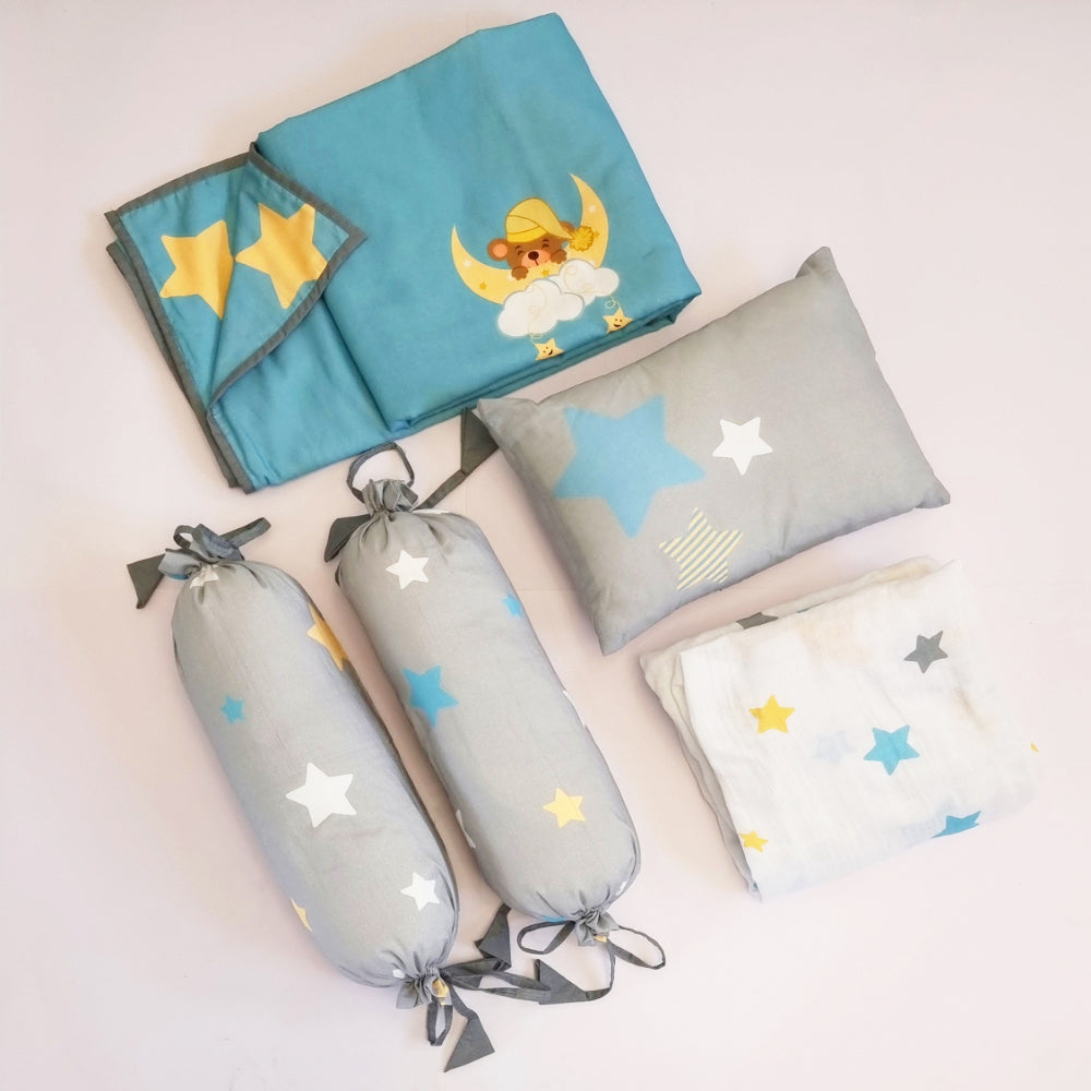 • 1 Cot fitted sheet fits mattress 27.5 x 55" (70 x 140cm) upto 6" deep and has an elastic all around the edges for a secure fit, 1 Baby Cotton Pillow 9" x 12, 2 Bolsters 14" x 18" and 1 Dohar Blanket 40" x 40"