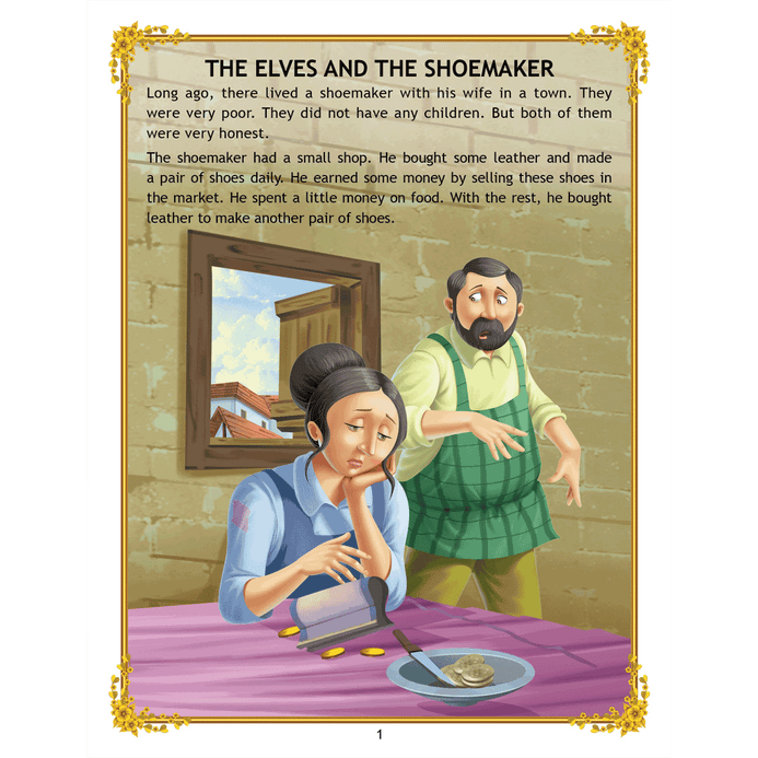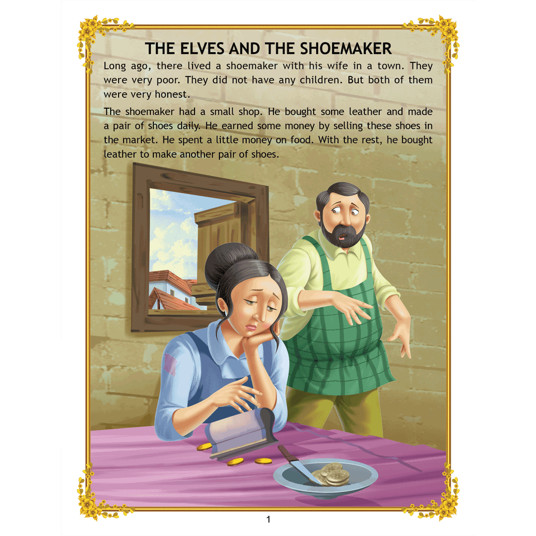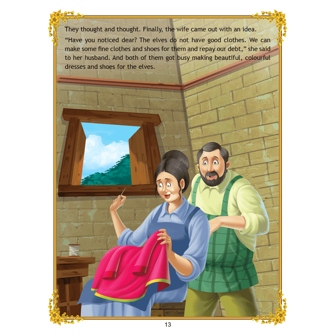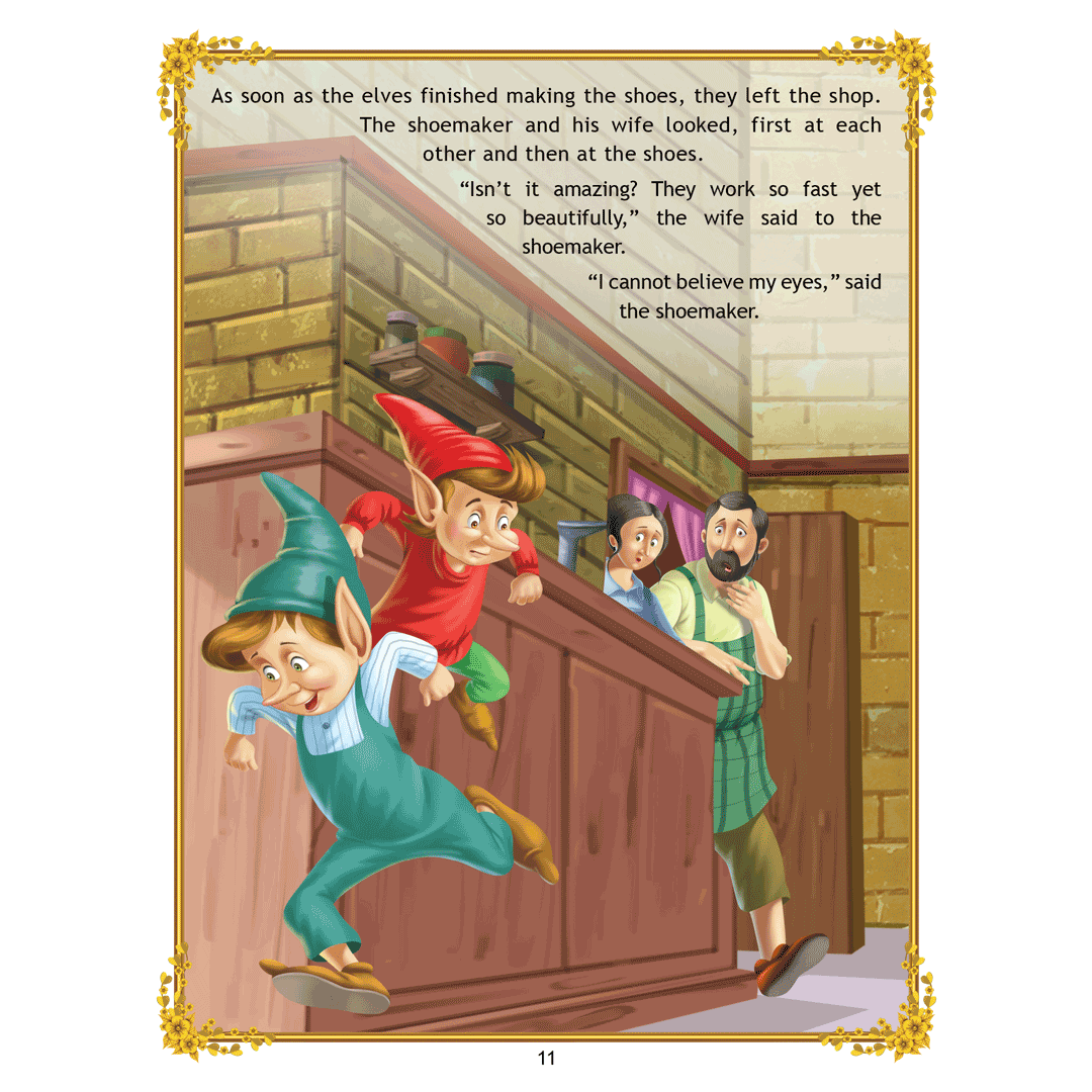 ‘The Elves and the Shoemaker’ – a short but very sweet story of a poor shoemaker who receives much-needed help from young helpful elves, and in return the shoemaker’s wife stitches cute clothes for them as a gift. Designed to entertain, educate, and engage young readers, this storybook teaches a gentle lesson that we must be thankful for all the help we receive from others. • 16 pages • Ideal for age-group 2-6 years • Amazing illustrations • Colourful cover • Inculcates reading habit This storybook is sure to become a favourite of all readers. Filled with emotions, this story will enchant young readers and listeners. Easy-to-understand text ensures that kids enjoy reading it and improve their language skills as well.