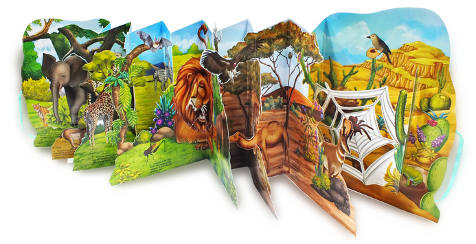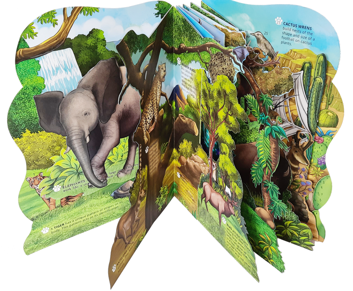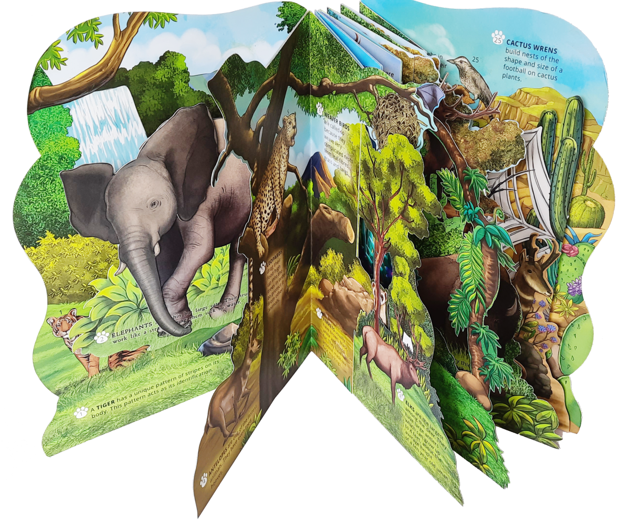 A wonderful, 3D, Pop-up book with 360 degree view for learning interesting facts about land animals. The panoramic view of different habitats of animals and the must-know facts about them helps the reader understand the science about living organisms and their differences. STEAM learning is enhanced with this book.