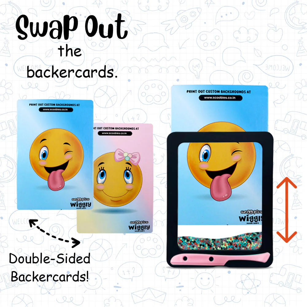 Pack Includes: Wiggly Doodle Board with a plastic stylus. It is filled with transparent gel and colored beads. It also comes with a double-sided replaceable backer card.
