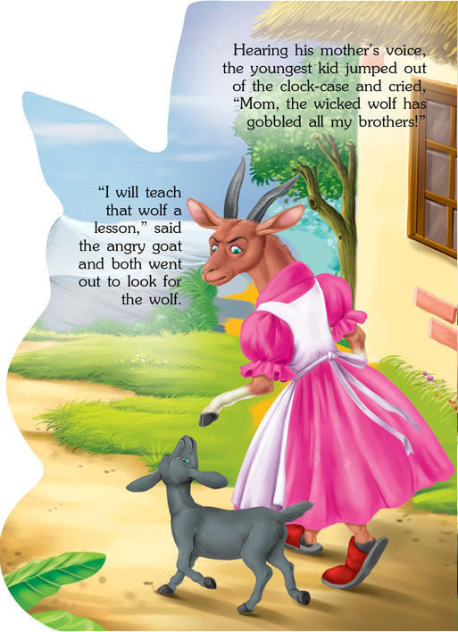 ‘The Wolf and the Seven Little Kids’ is a story of the rescue of the goat kids from the wolf’s belly. This interesting story will captivate readers with its delightful illustrations and die-cut design. • Reading age 2-5 years • 12 pages • Beautiful colourful illustrations • Printed on durable board • Attractive die-cut presentation This timeless tale of a wolf and seven little kids with an attractive look is bound to be a great gift and treasured by young readers.