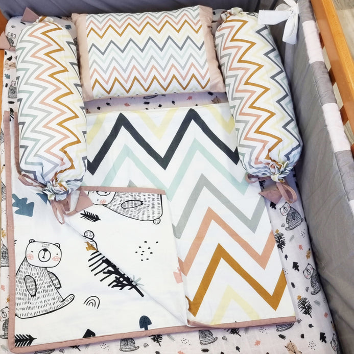 You only want the best for your baby, which includes the bedding they sleep on for many hours a day. Children’s bedding should be bright and sweet just like the little ones who use it. Without sacrificing style or quality, we've curated a batch of bedding that will offer comfort through all the excitement of childhood. If you're looking for children's bedding for a new arrival, our crib bedding sets are perfect to get started with. Our children's bedding have perfectly matched sets comprising of 100% muslin organic cotton fitted sheets ( Fits mattresses 27.5(W) x 55"(L) (70 x 140cm) upto 6" deep), 1 100% organic rai pillow with filler ( 8" Width by 12" Length), 2 100% organic cotton bolsters with fillers ( 14" circumference by 18" Length) and a 100% organic dohar blanket (40" Width by 40" Length) to create a playful look in your child's room. Don't forget to finish the look with our adorable throw pillows which are so cuddlesome. This lightweight and breathable set is just what you need for the modern nursery. Some would say it's love at first cuddle. Give the gift of sweeter dreams to your bundle of joy ! One super-soft crib sheet, one rai pillow, two bolsters and one baby blanket make for a beautifully loving gift.