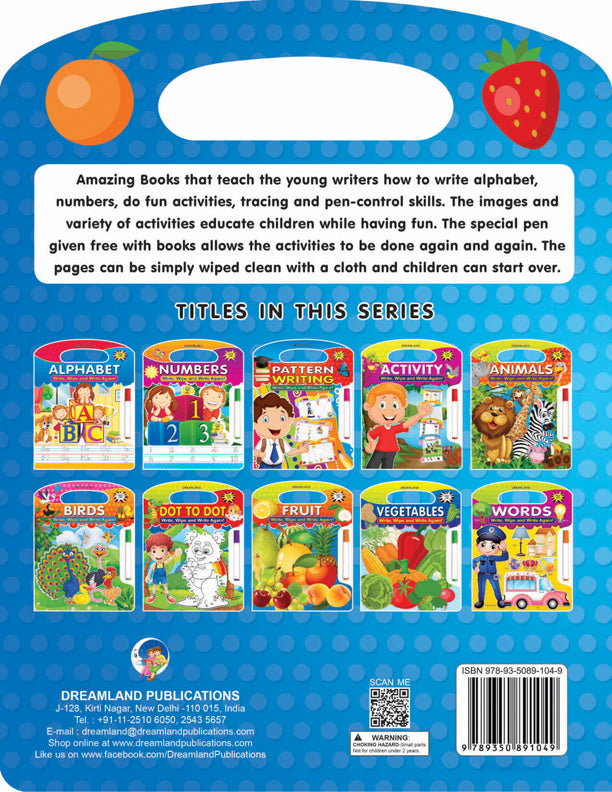 Featuring 16 pages of interesting activities, ‘Write and Wipe and Write Again – Fruit’ this book will make early learning fun for preschool-age children. The colourful images of the book make learning interesting. • Ideal for age-group 2-4 • 16 colourful pages • Cute vibrant images • Marker pen It is an ideal book for little ones to enable them to practice over and over to improve their pen control and writing skills. The pages can be simply wiped clean with a cloth and children can start over. It is the best tool to boost the confidence of tiny tots.