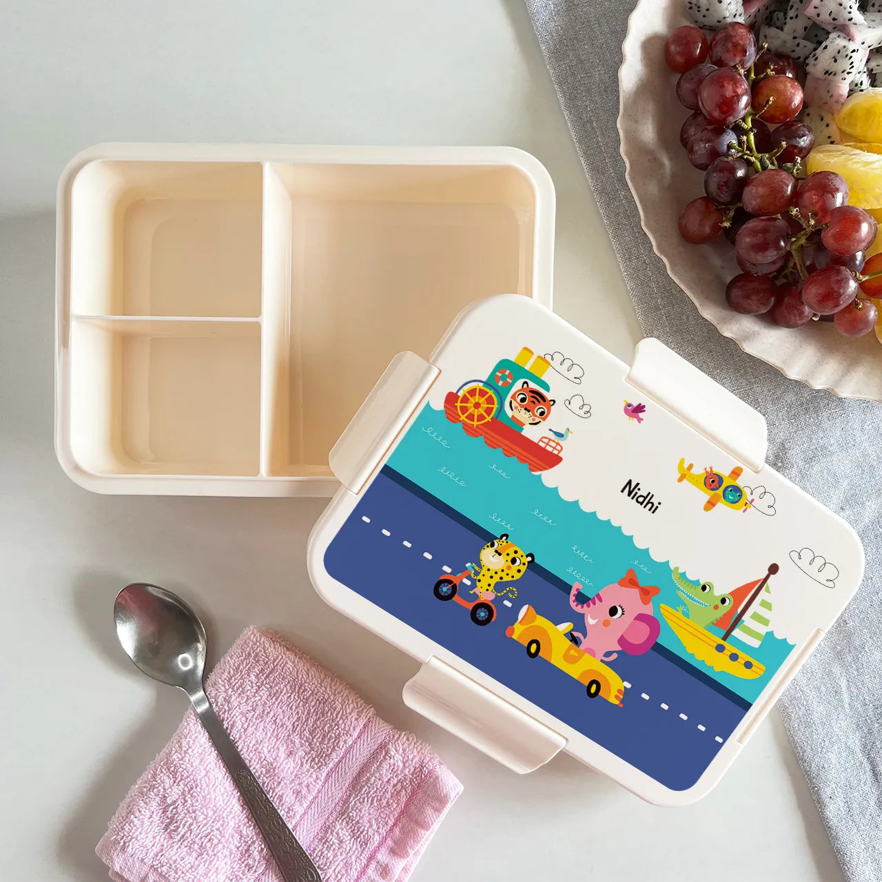 Make mealtime fun and hassle-free with our Personalized Lunch Box, made from high-quality, BPA-free plastic and designed with three built-in compartments for easy storage and organization of meals and snacks. Choose from 20+ unique designs and personalize it with a name on top, creating a one-of-a-kind rectangular bento lunch box that kids will love. Lightweight and durable, it’s perfect for school, classes, travel, or on-the-go snacking. It’s also a thoughtful addition to birthday return gift hampers and easy for little ones to carry. Customize your lunch box today and make every mealtime extra special! Do Not Microwave.