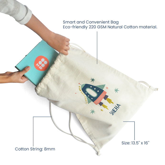 Is your child always headed for different activities? Are you looking for a smart but convenient bag while travelling? Customize these designer Drawstring Bags for your kids with their name or any text of your choice! These custom drawstring bags are perfect gift for birthday parties, return gifts, back-to-school gifts etc. A personalised drawstring bag is an ideal way to give your kids the joy of storing their favourite things. It looks adorable and is convenient for travelling or for short errands. Moreover, they are made from natural cotton material that is soft and comfortable to wear on their shoulders.